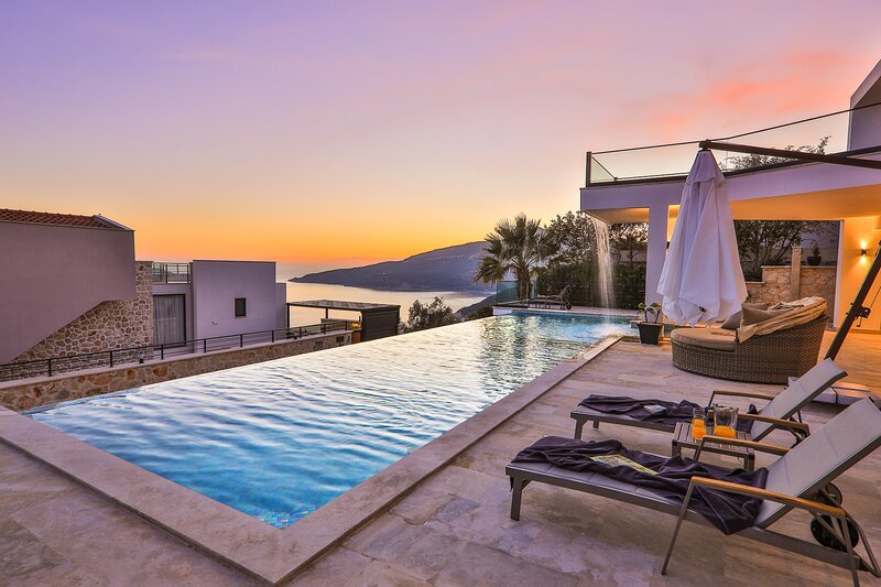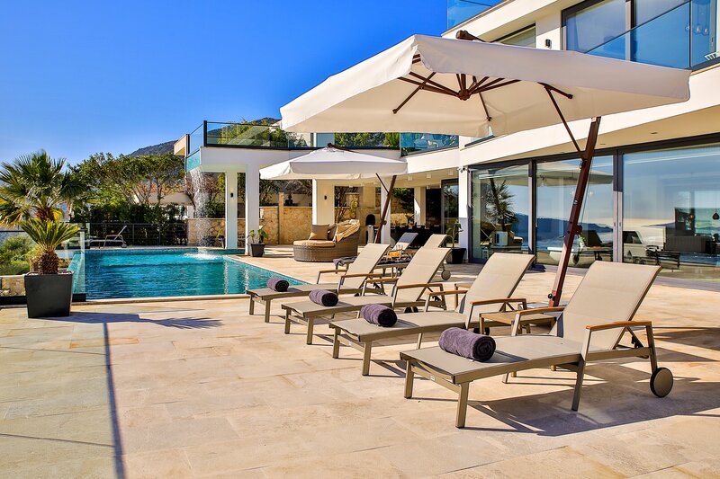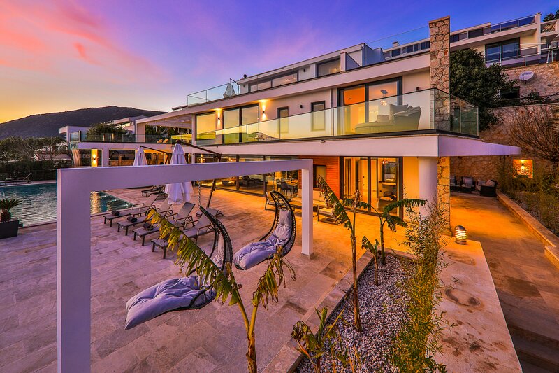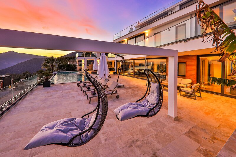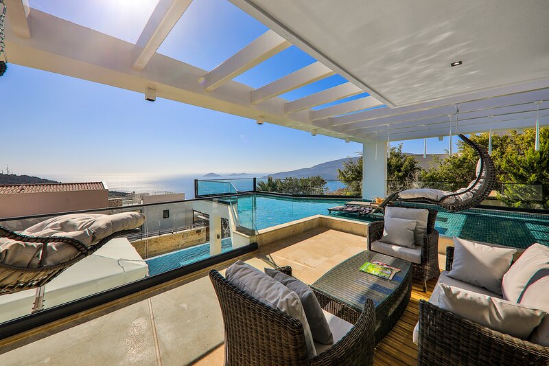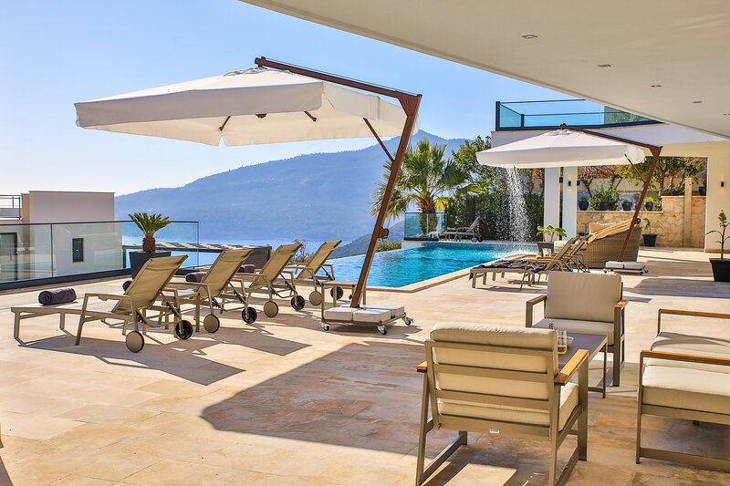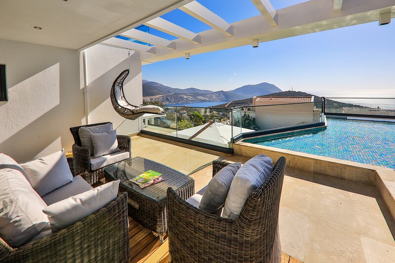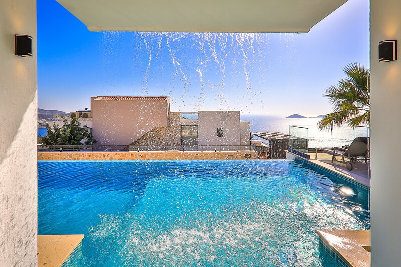 From its luxury amenities to its high-end designer finish, there are so many elements that make this villa stand out. The villa overlooks Kalkan Bay, Mouse Island and Snake Island, a view best appreciated at sunset... sit on the steps of the pool, let the jets massage and relax you while indulging in the breath-taking views of the sea. Lie back and relax in the infinity pool with the waterfall overflowing from the master suite infinity pool. Relax to the sounds of flowing water or gaze across the waterfall onto the seating area and pool bar beyond. If you are looking to hide from the midday sun, why not take yourself to the side garden and relax in the hammock with a good book.