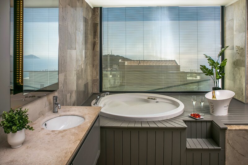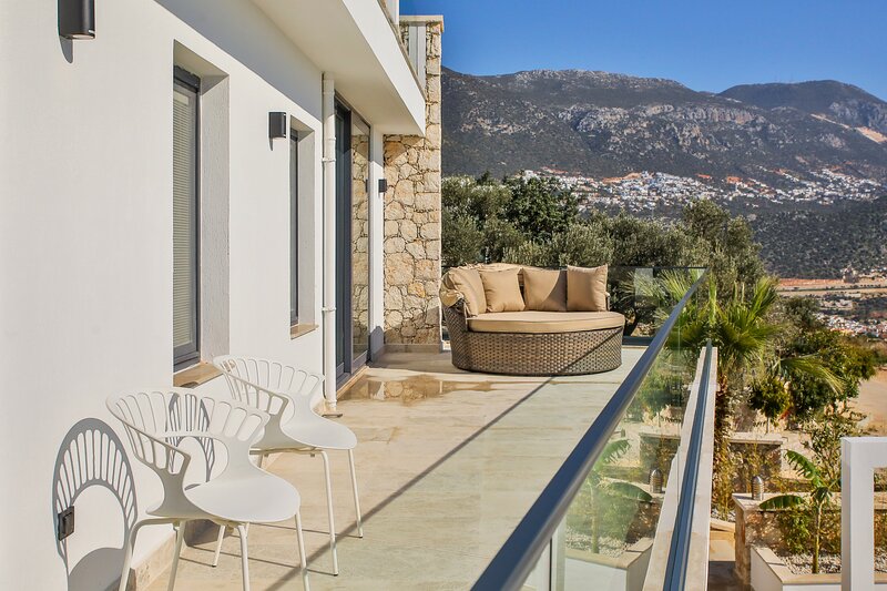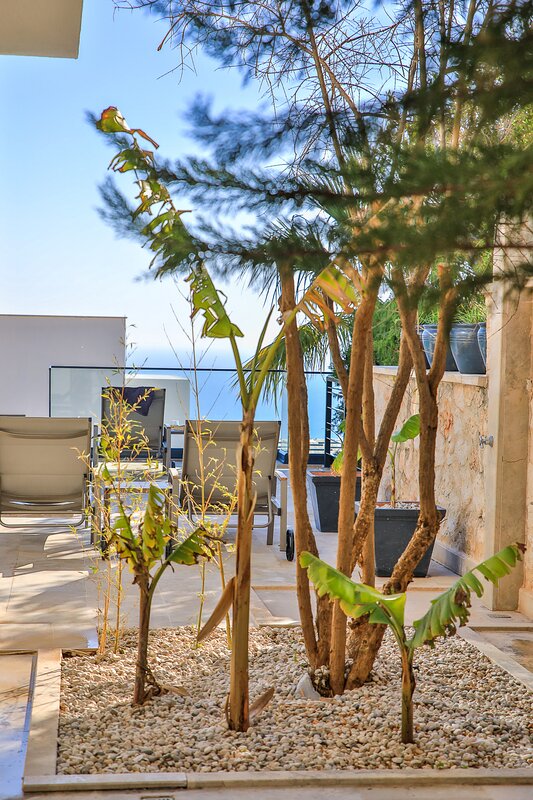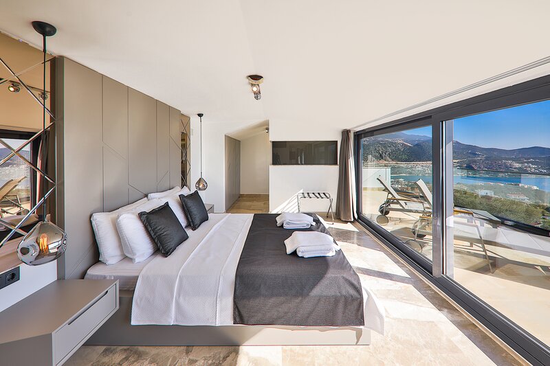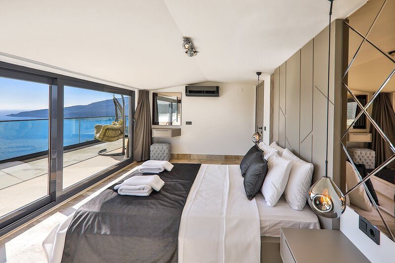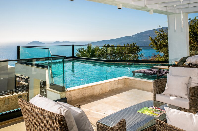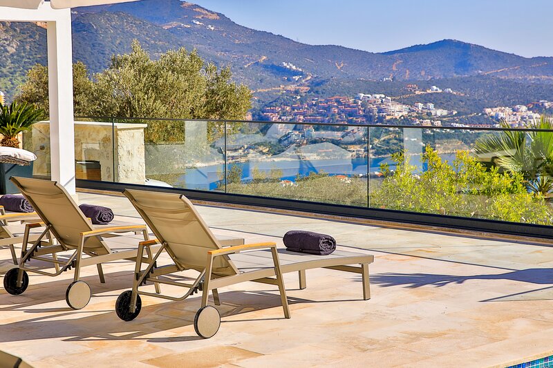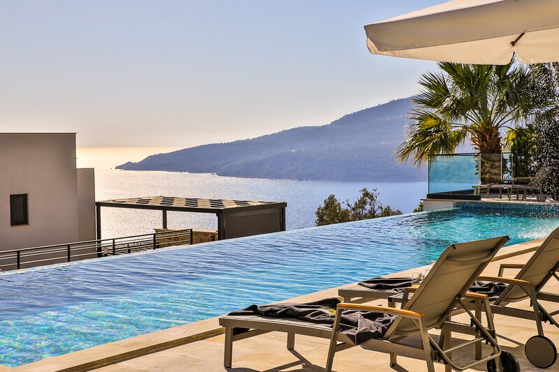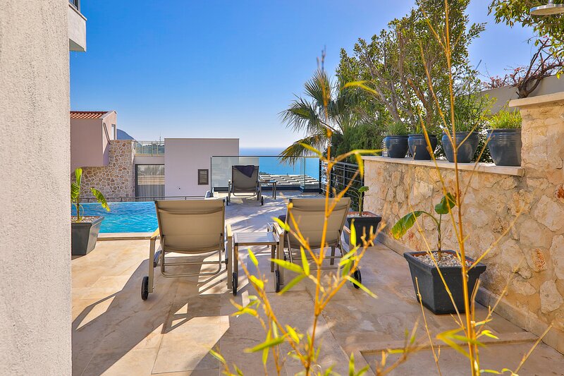 From its luxury amenities to its high-end designer finish, there are so many elements that make this villa stand out. The villa overlooks Kalkan Bay, Mouse Island and Snake Island, a view best appreciated at sunset... sit on the steps of the pool, let the jets massage and relax you while indulging in the breath-taking views of the sea. Lie back and relax in the infinity pool with the waterfall overflowing from the master suite infinity pool. Relax to the sounds of flowing water or gaze across the waterfall onto the seating area and pool bar beyond. If you are looking to hide from the midday sun, why not take yourself to the side garden and relax in the hammock with a good book.