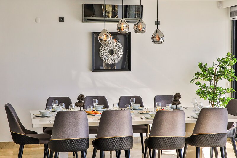 Ground floor: On the ground floor there is one en-suite double bedroom with fully fitted, bespoke wardrobes and makeup area. The modern, spacious lounge is flooded with light by the walls of glass doors and looks out onto the expansive terrace and pool area. The 75" TV and surround sound makes it a beautiful space to enjoy a movie together. This floor boasts a reading area with handcrafted chairs and coffee table. The marble kitchen and breakfast bar consist of all the amenities needed while staying at Villa Lavaya. The marble dining table seats 14 and is the perfect place if you want to eat indoors. At the rear, sliding doors open out onto the games area. A WC is also provided on this level.