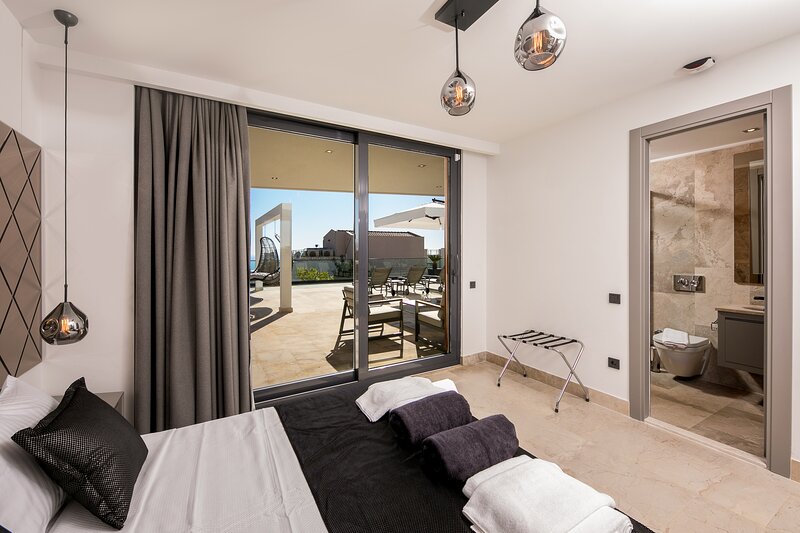 First floor: On the first floor you will find two en-suite bedrooms, one double and one twin (can be made into double on request), with bespoke fitted wardrobes and dressing/make-up area. Each bedroom has floor to ceiling glass doors which open up onto a large balcony with seating to enjoy the views of the water. A spacious master suite is meticulously designed with king-size bed, walk-in wardrobes and a luxurious bathroom where you can enjoy a relaxing Jacuzzi bath or a relaxing shower with sea views. But, the most incredible part of this master suite is the private Jacuzzi and plunge pool which sits on the terrace. A unique waterfall cascades from this first floor pool into the expansive main infinity pool below. Two large bamboo cushioned swings hang from the pergola and sit above the pool. If you prefer a sun lounger, lie back in one of the two that sit in this beautiful pool overlooking the sea.
