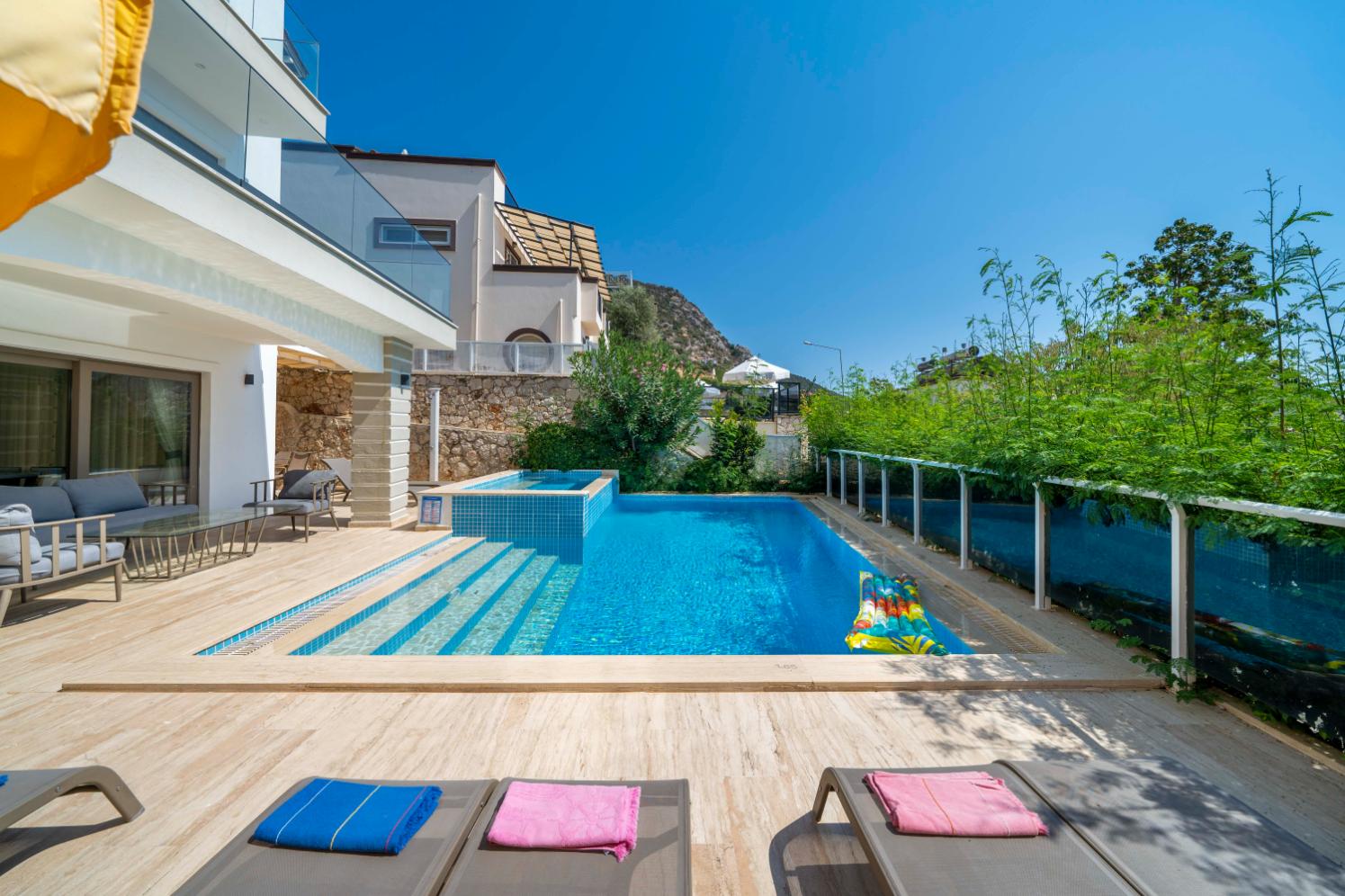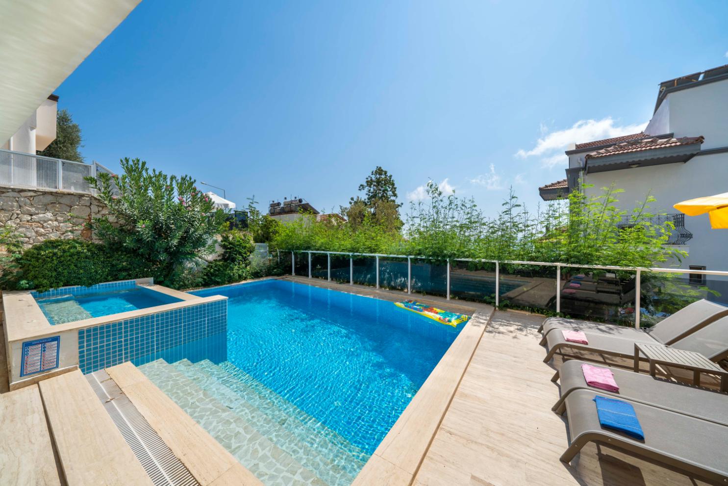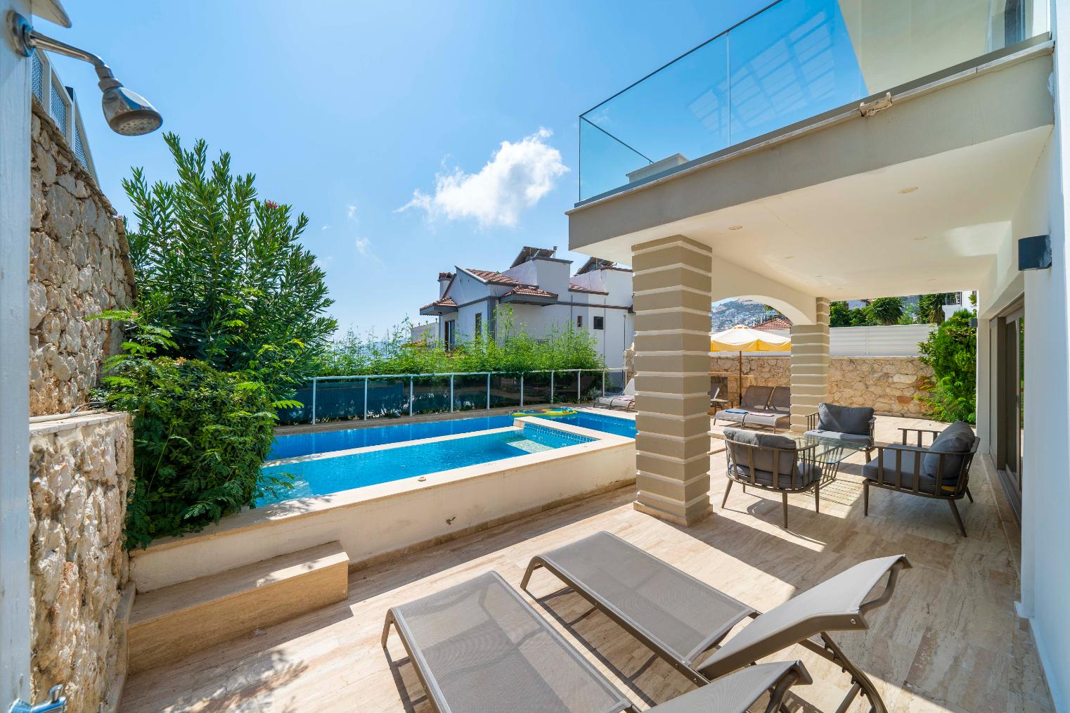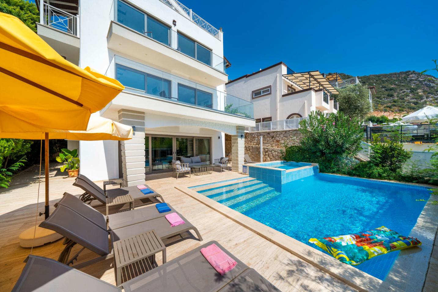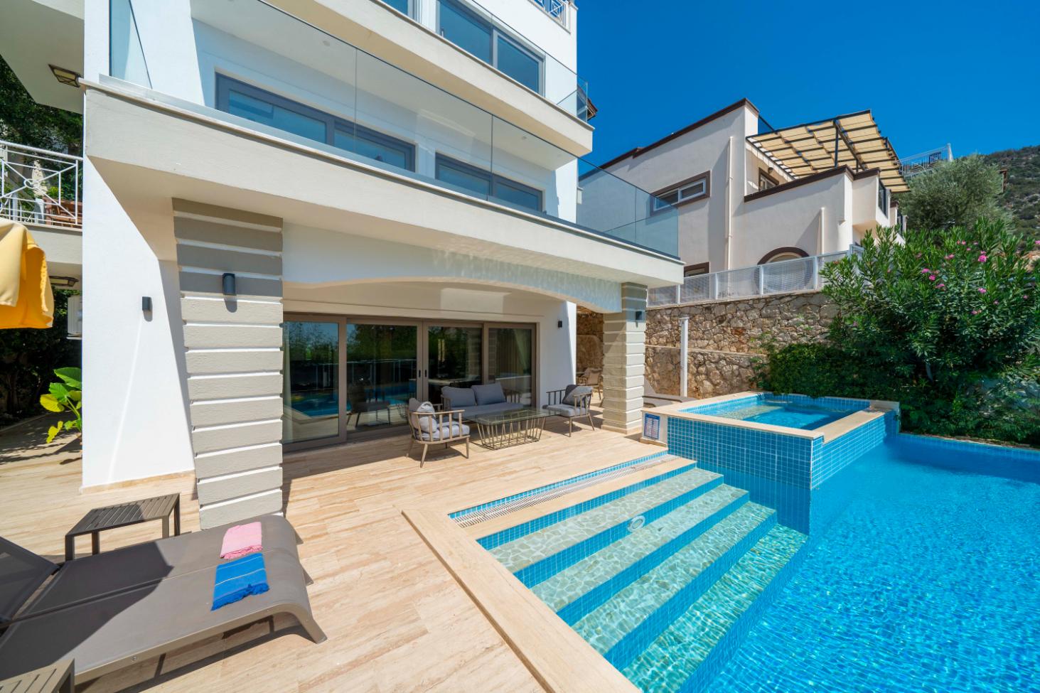 The villa’s private terrace features plenty of sunbeds, shaded dining space, a BBQ, and a freshwater pool with integrated Jacuzzi. Guests can relax by the pool or stroll into town within minutes, enjoying the best of both worlds.