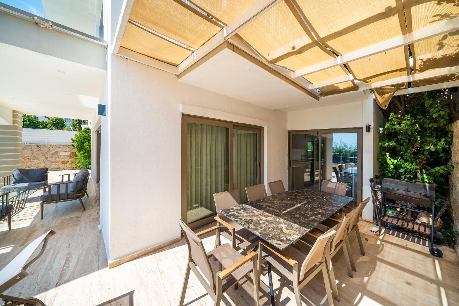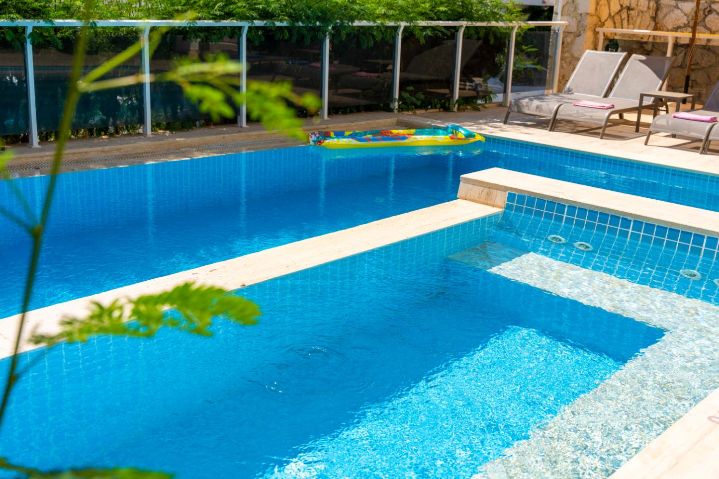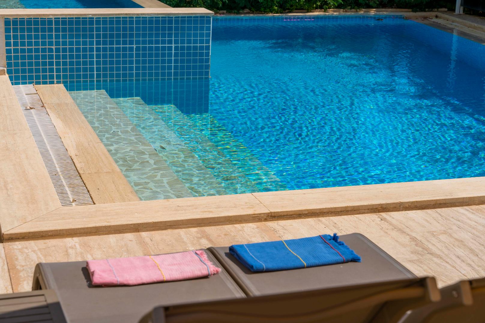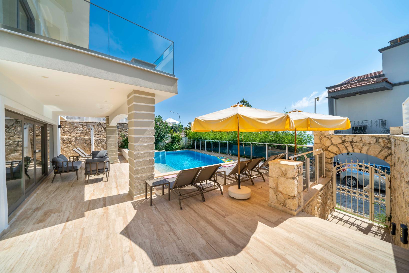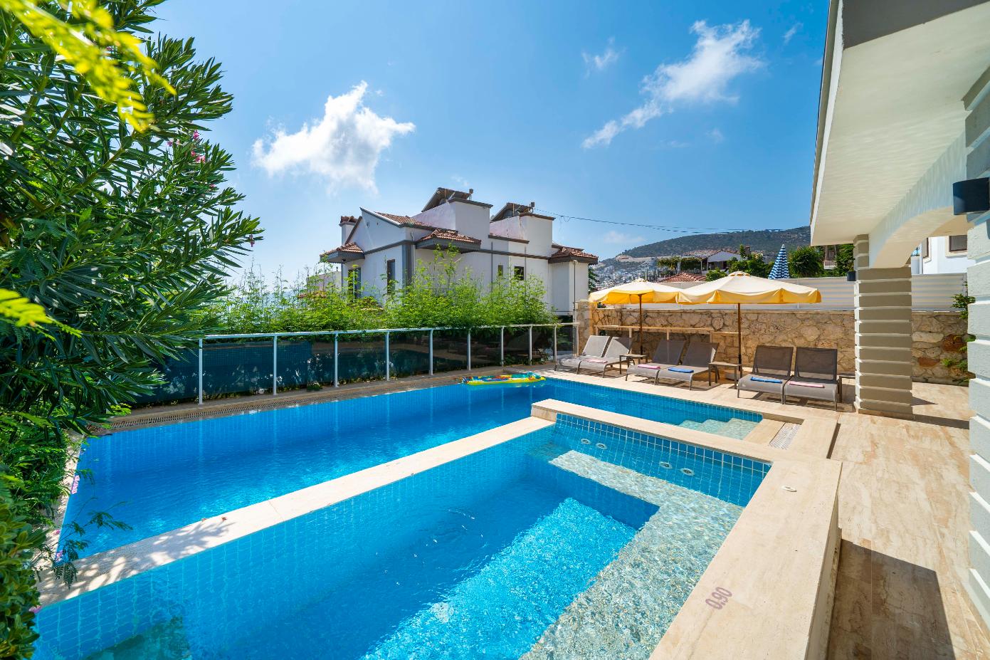 The villa’s private terrace features plenty of sunbeds, shaded dining space, a BBQ, and a freshwater pool with integrated Jacuzzi. Guests can relax by the pool or stroll into town within minutes, enjoying the best of both worlds.