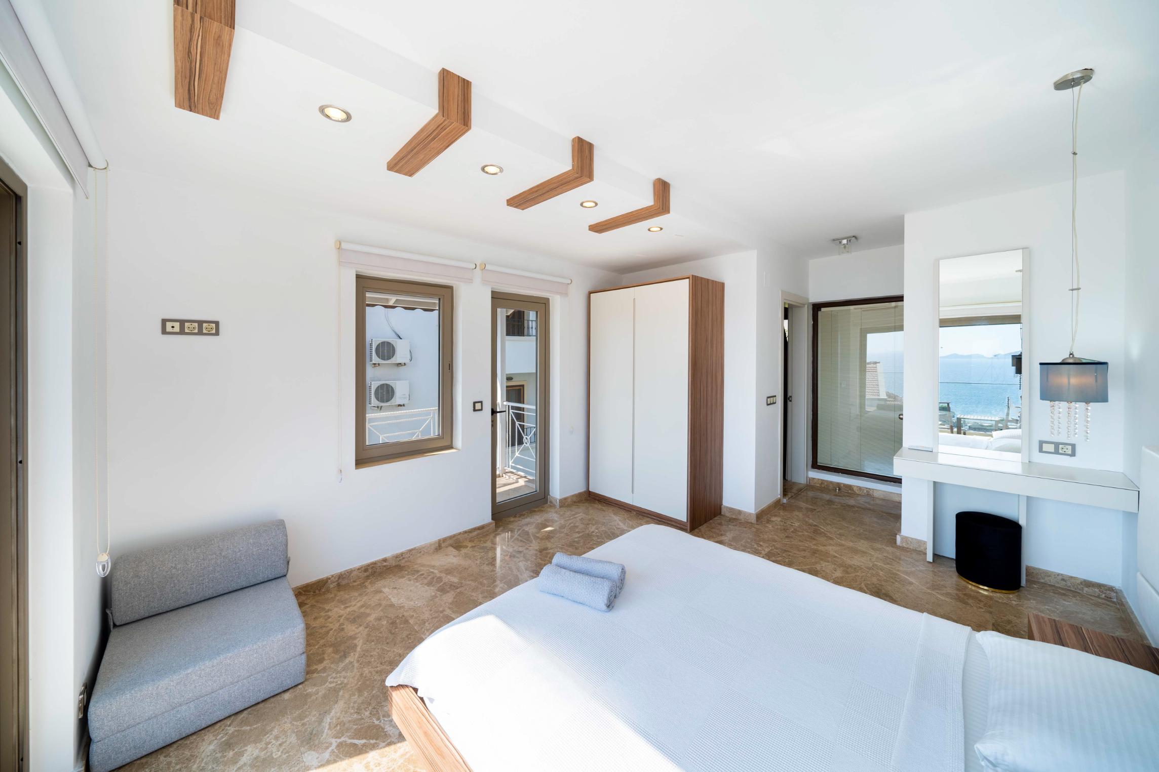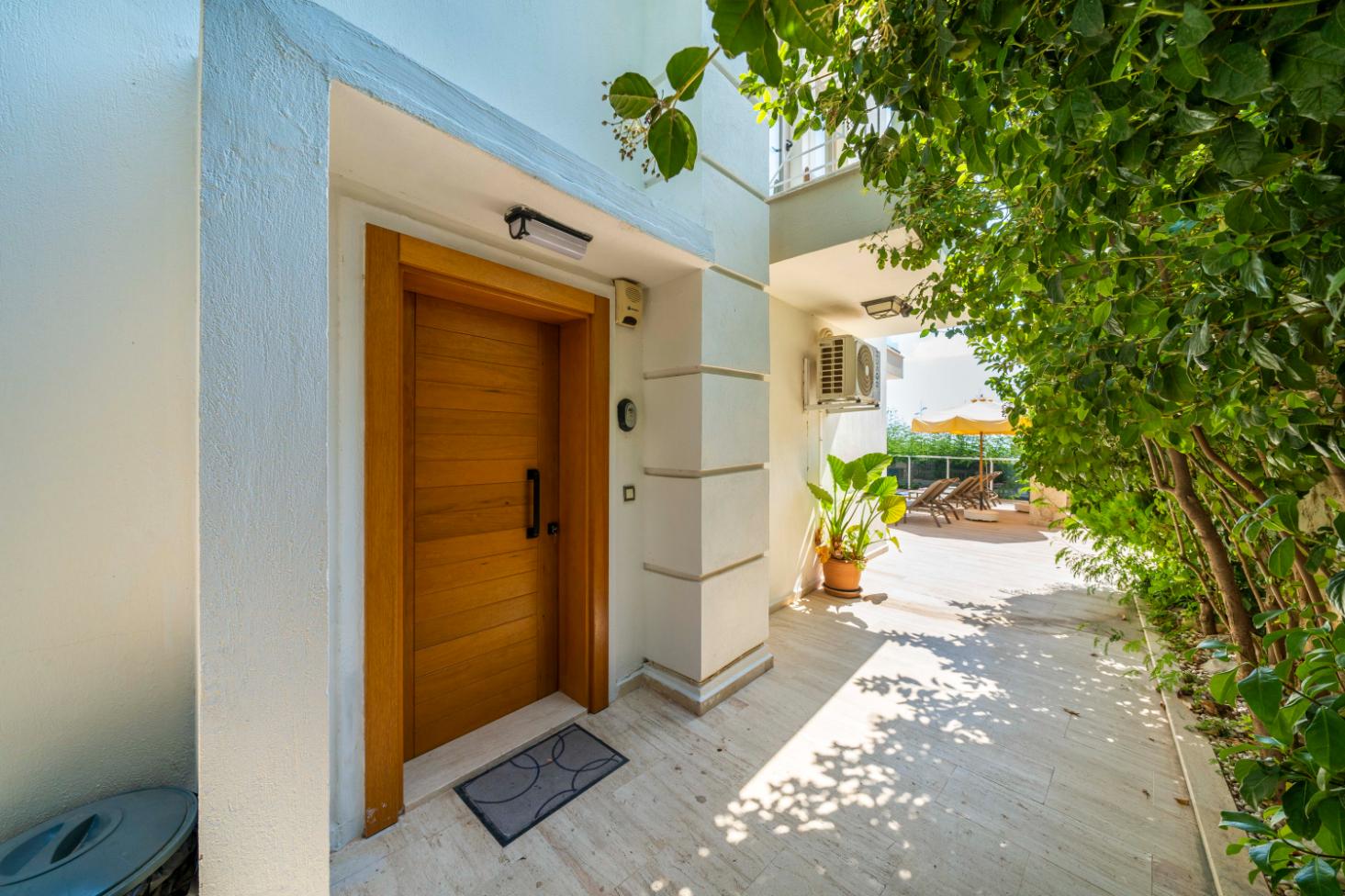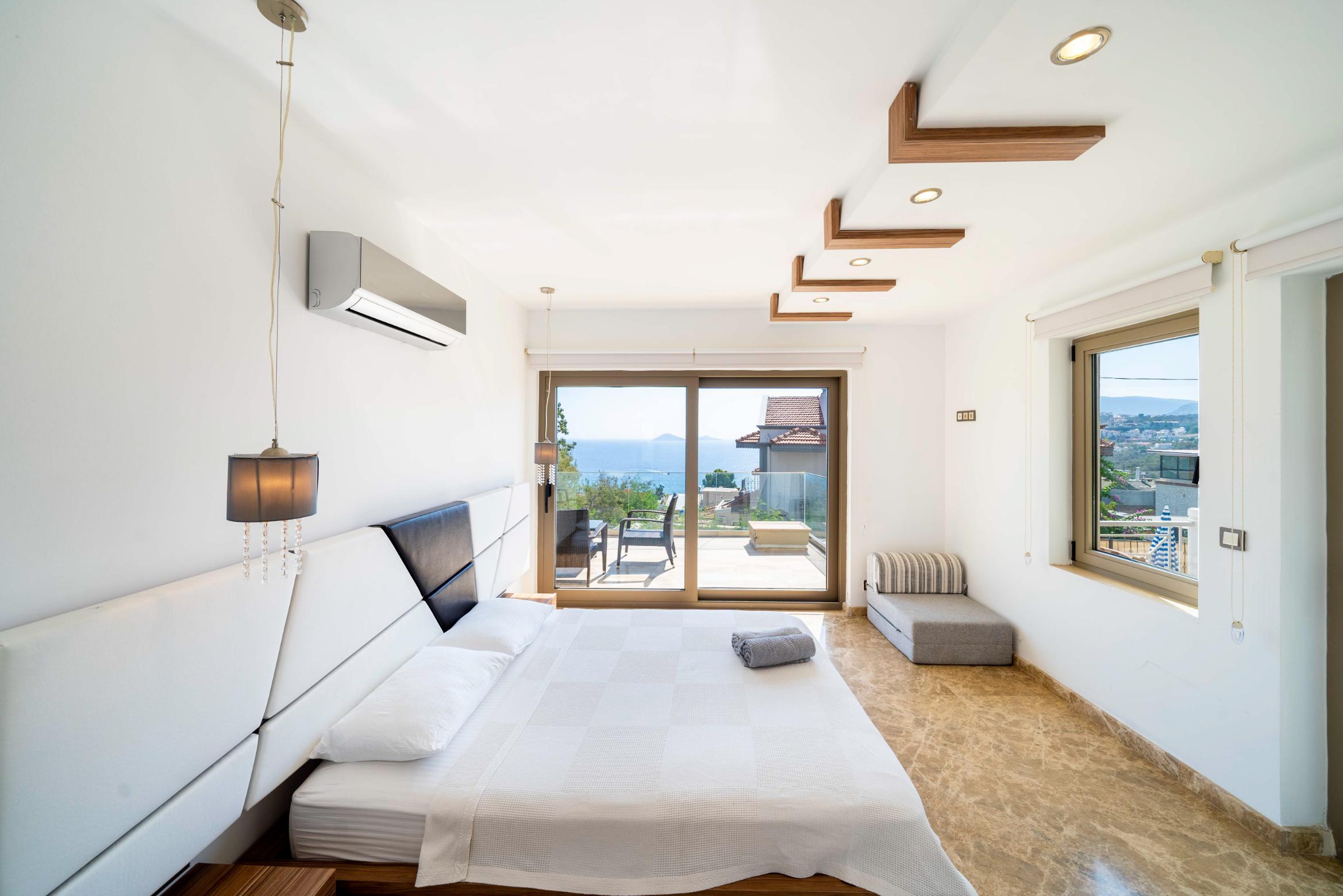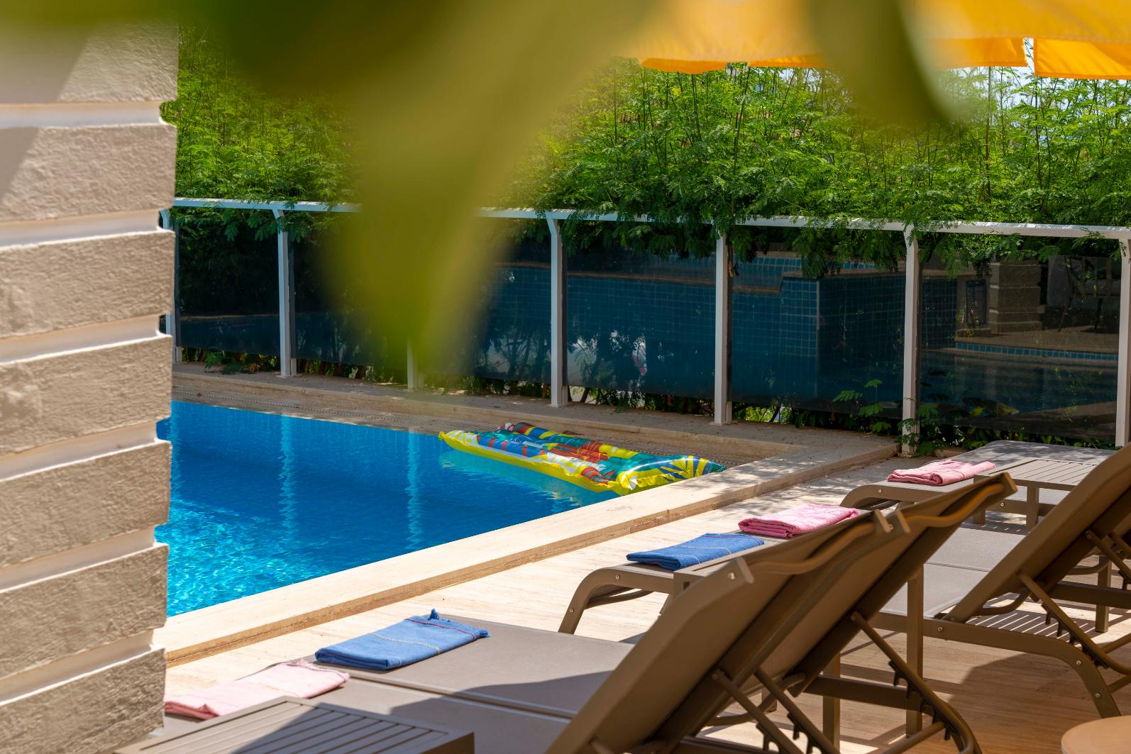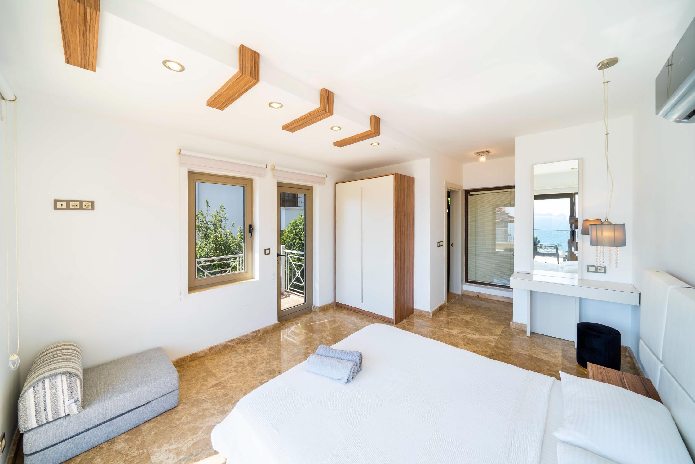 The villa’s private terrace features plenty of sunbeds, shaded dining space, a BBQ, and a freshwater pool with integrated Jacuzzi. Guests can relax by the pool or stroll into town within minutes, enjoying the best of both worlds.
