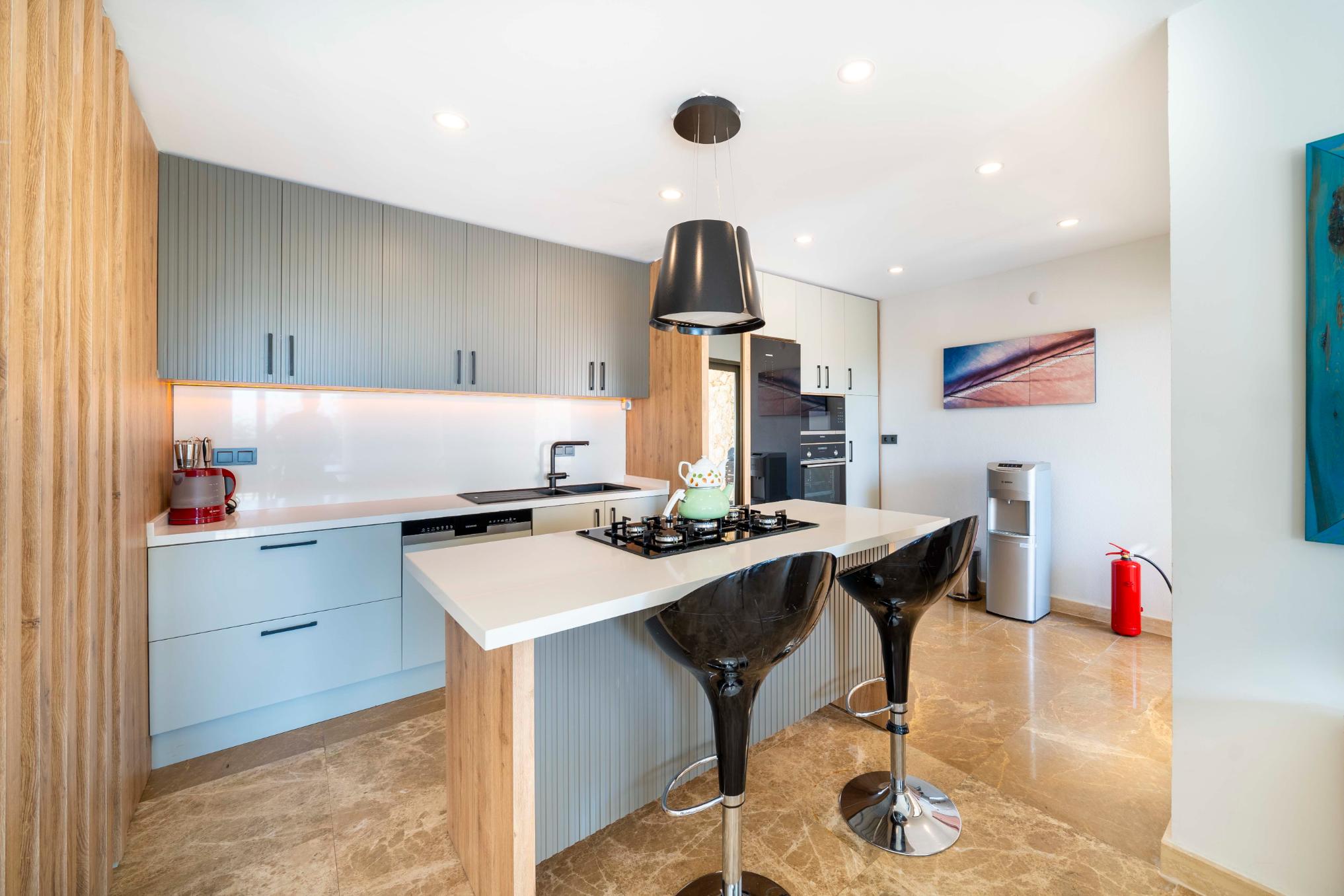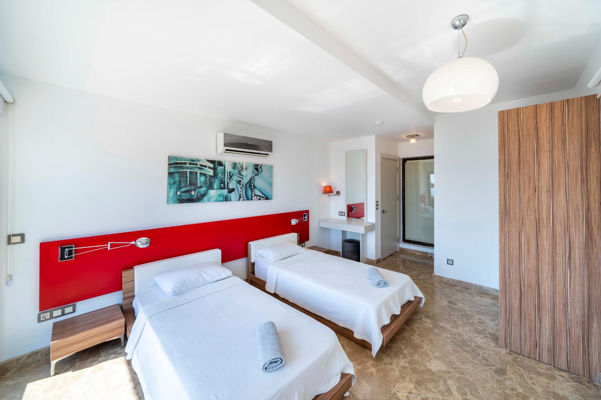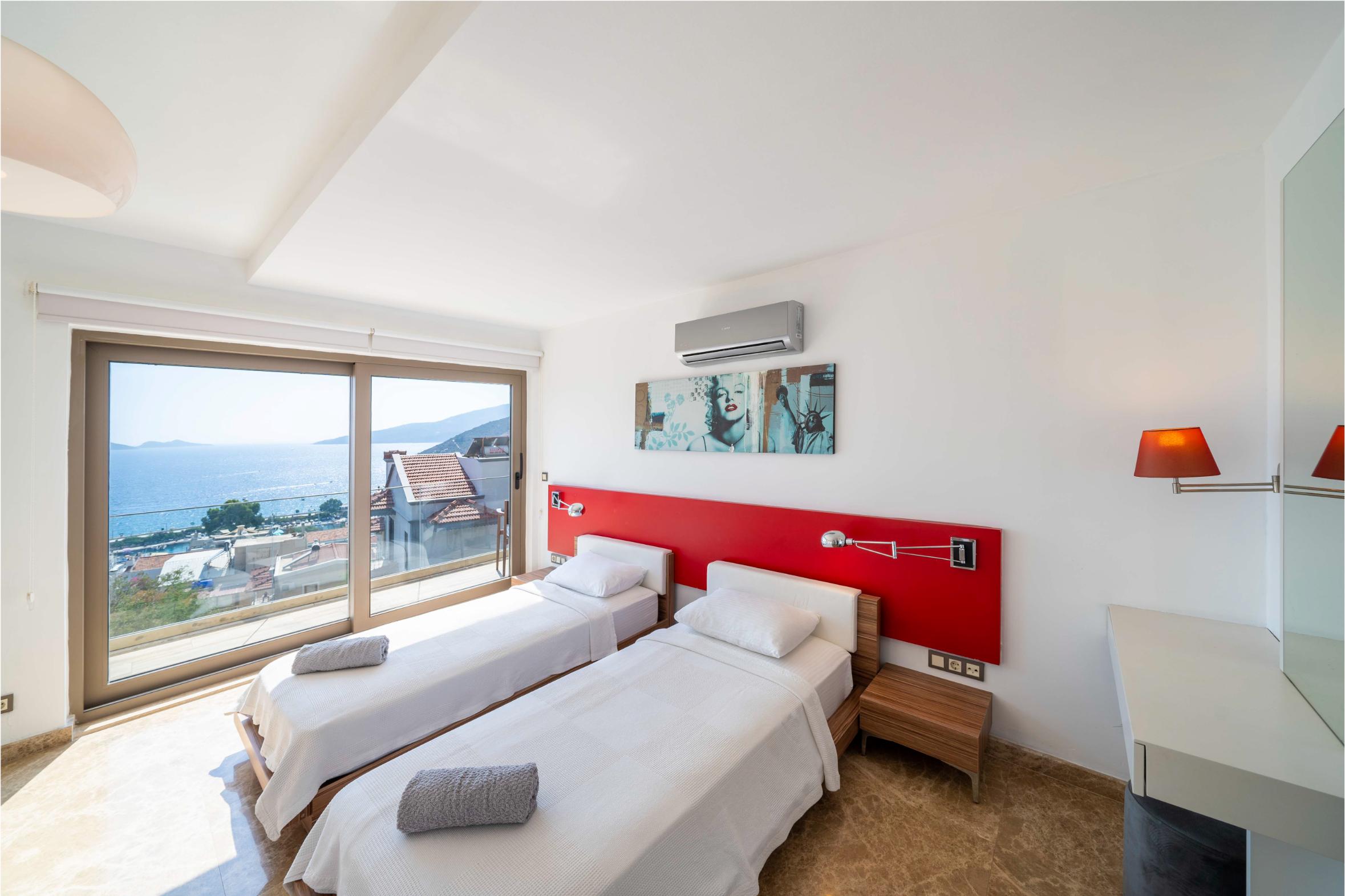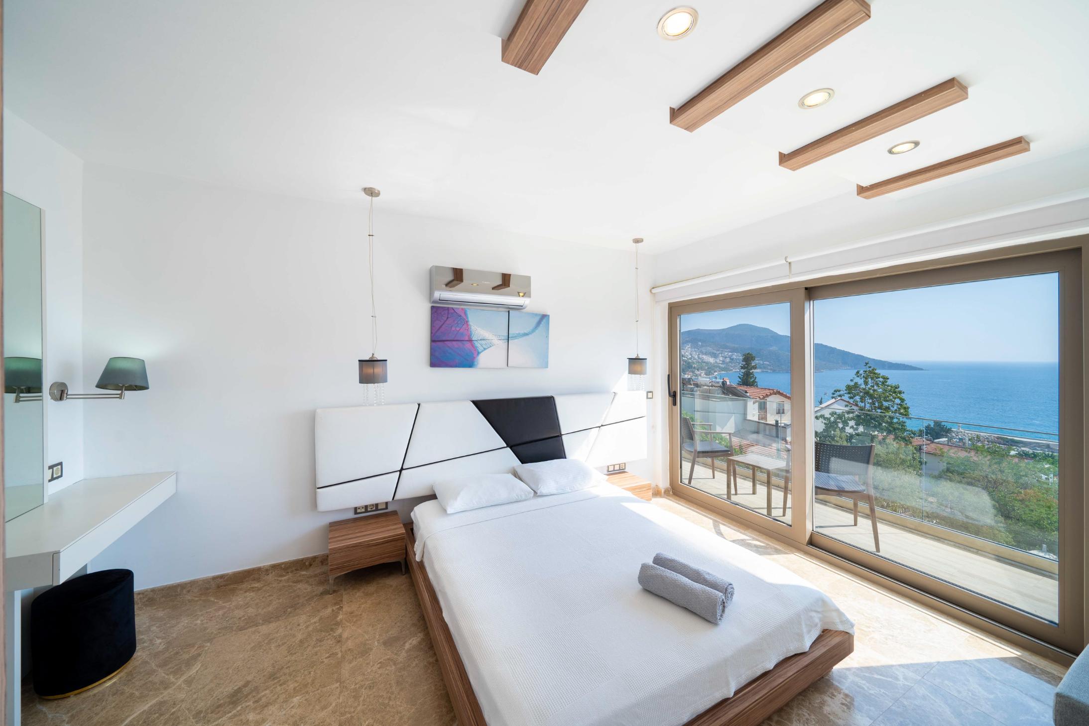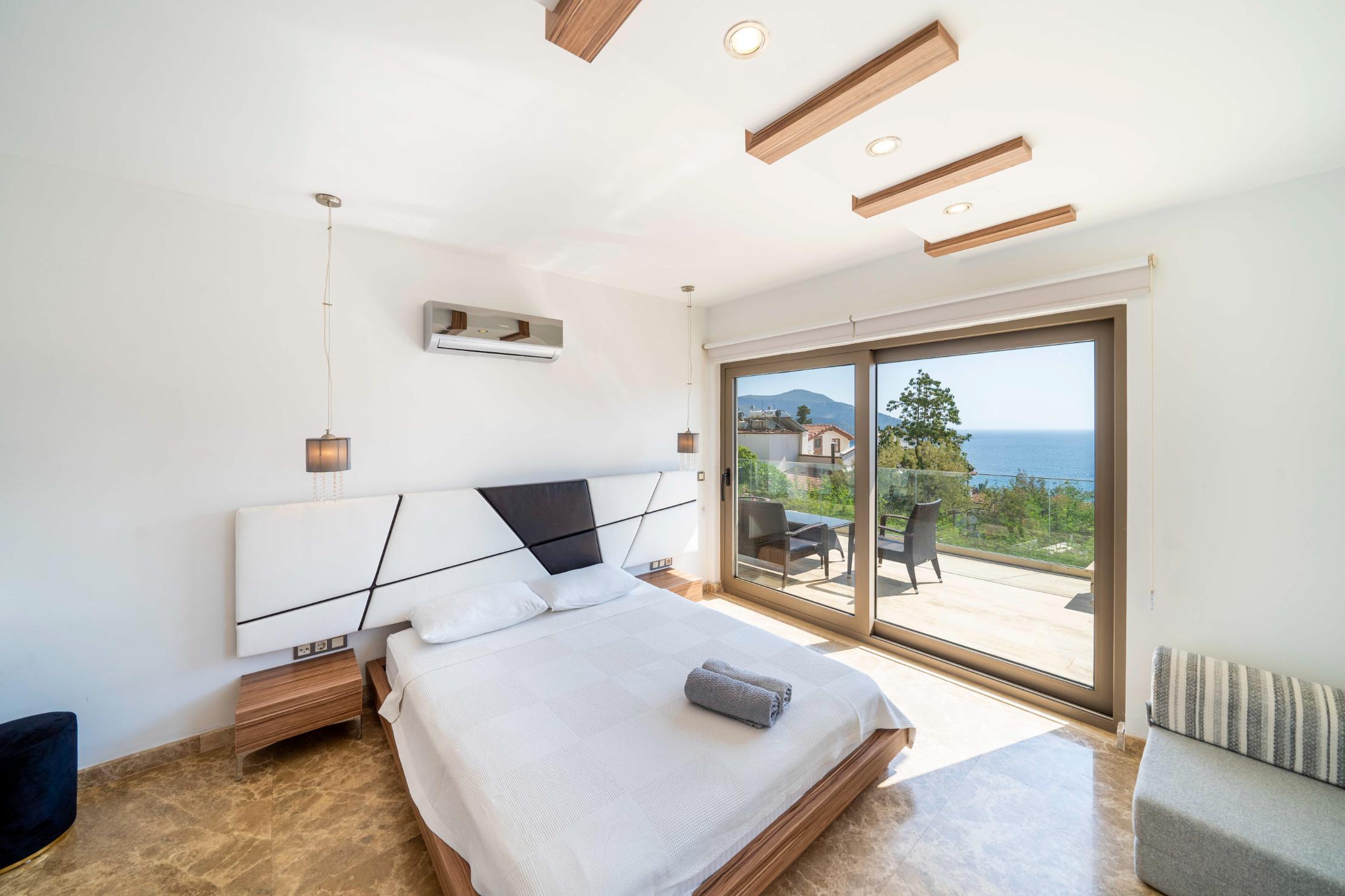 The villa’s private terrace features plenty of sunbeds, shaded dining space, a BBQ, and a freshwater pool with integrated Jacuzzi. Guests can relax by the pool or stroll into town within minutes, enjoying the best of both worlds.