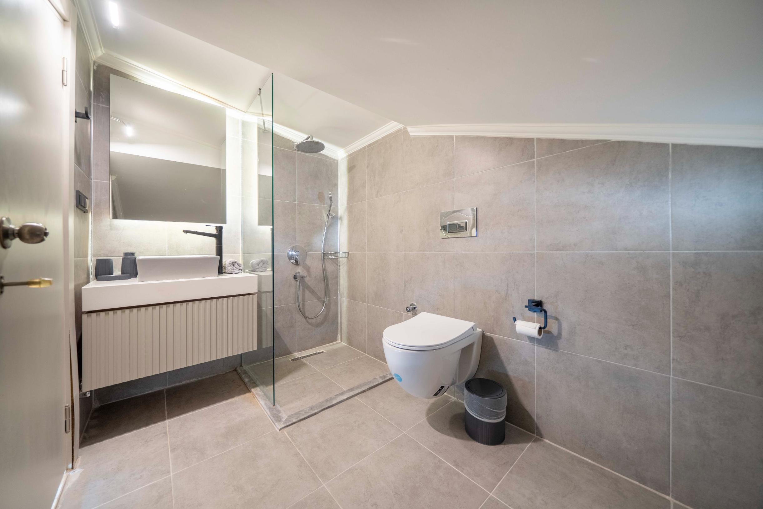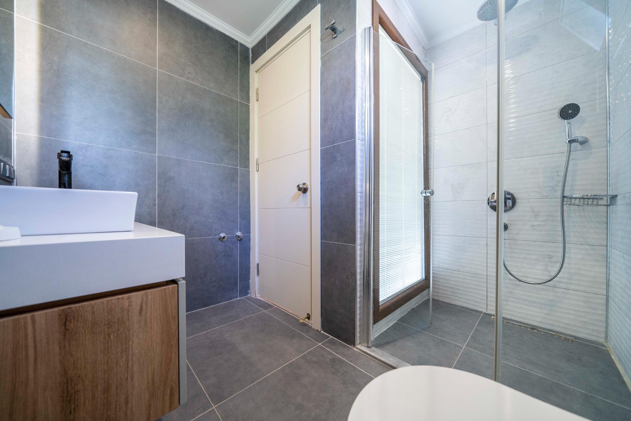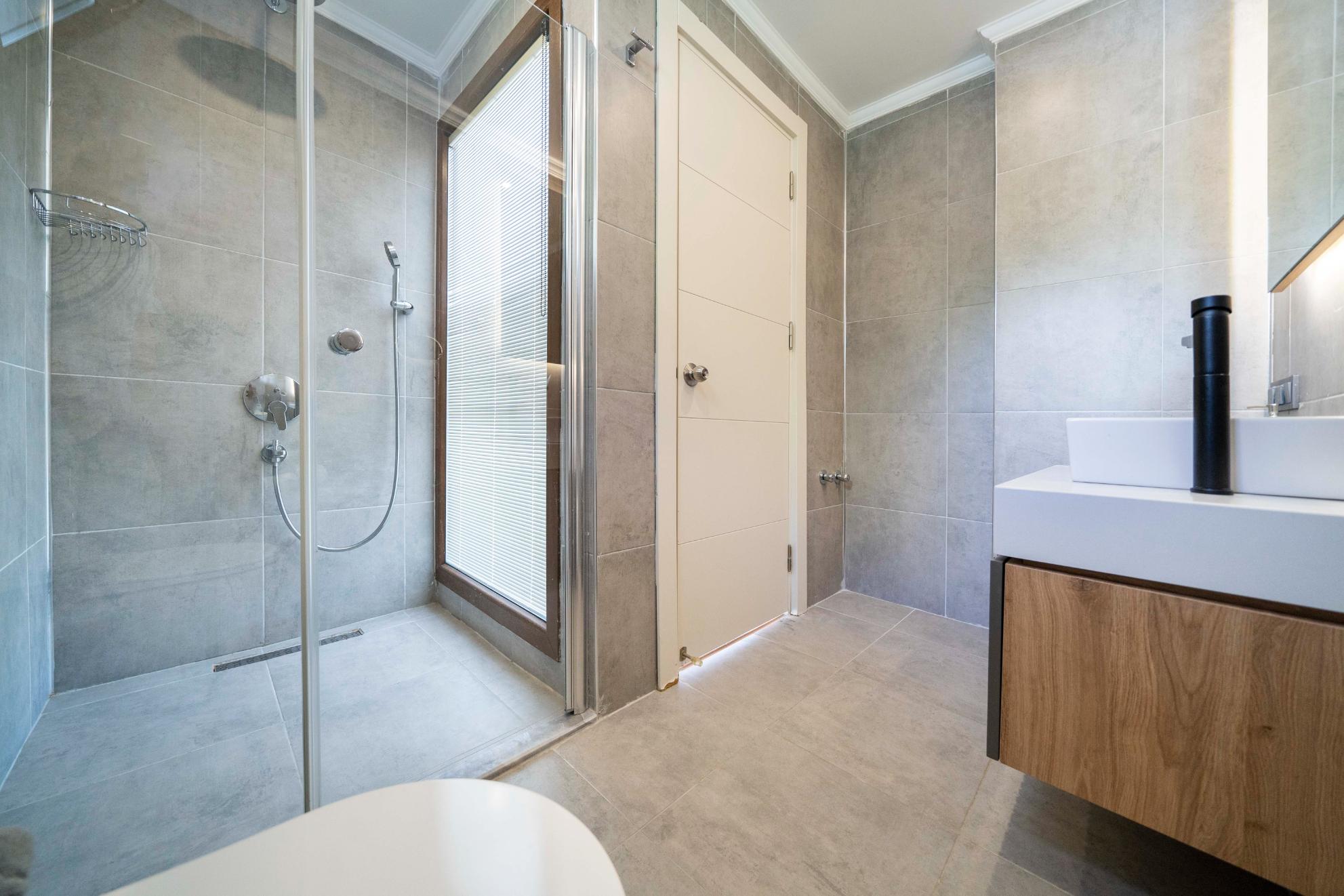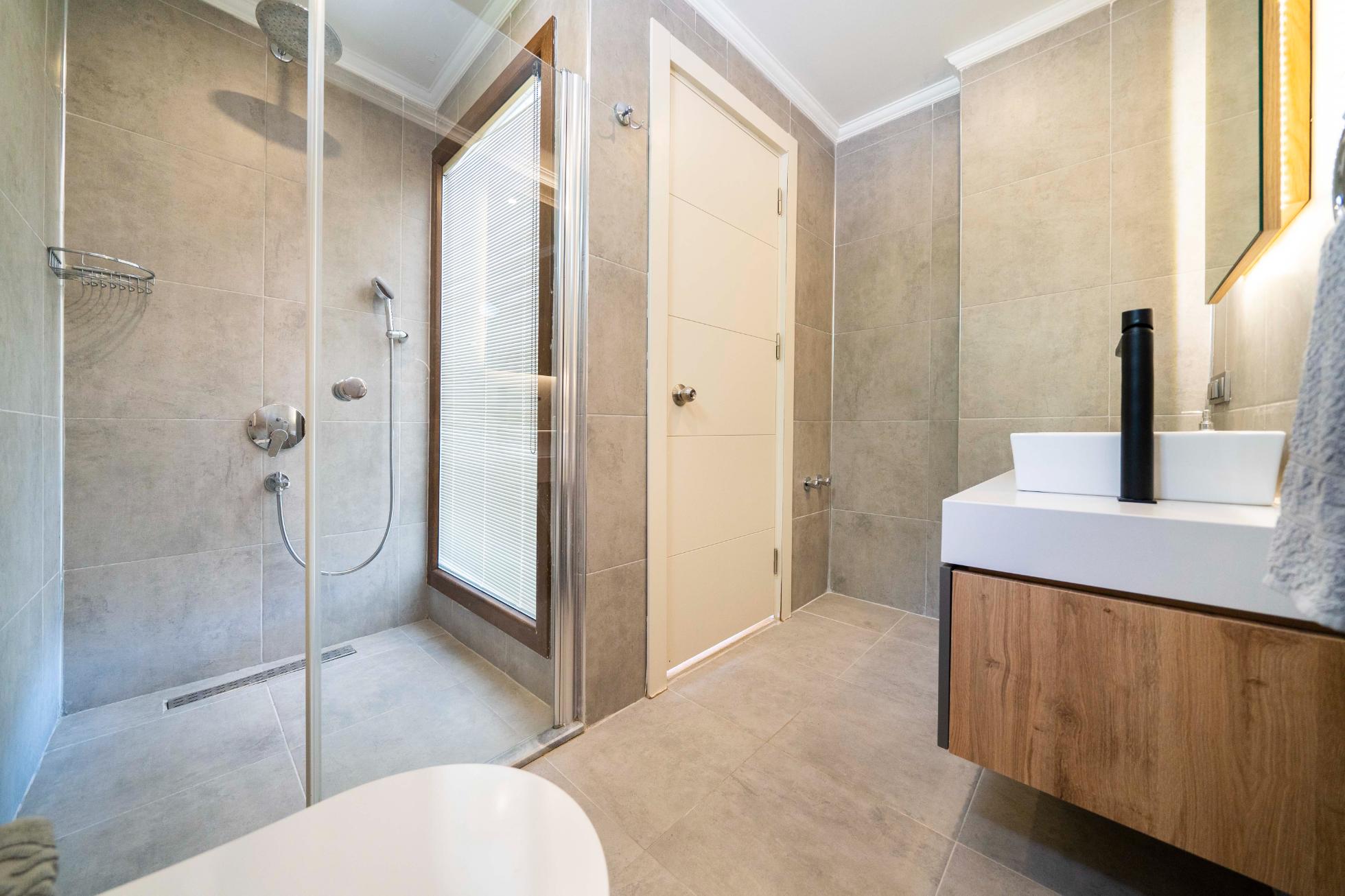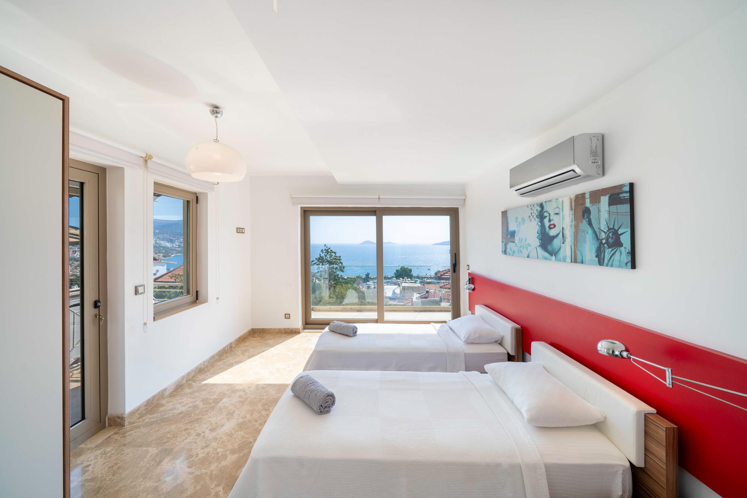 The villa’s private terrace features plenty of sunbeds, shaded dining space, a BBQ, and a freshwater pool with integrated Jacuzzi. Guests can relax by the pool or stroll into town within minutes, enjoying the best of both worlds.