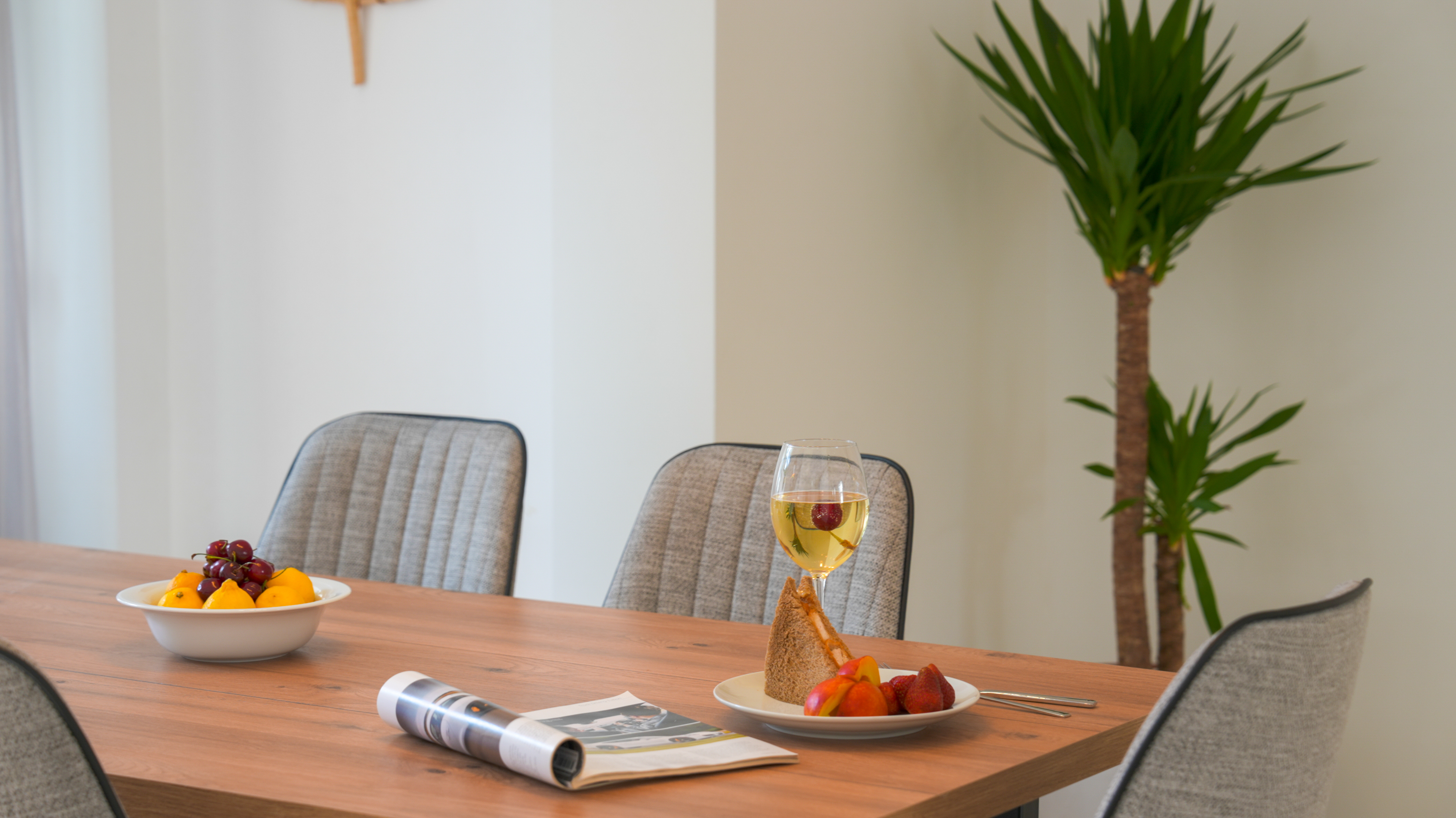 Next to the kitchen is a dining table that comfortably seats 6 people and sliding doors lead out to the pool terrace.