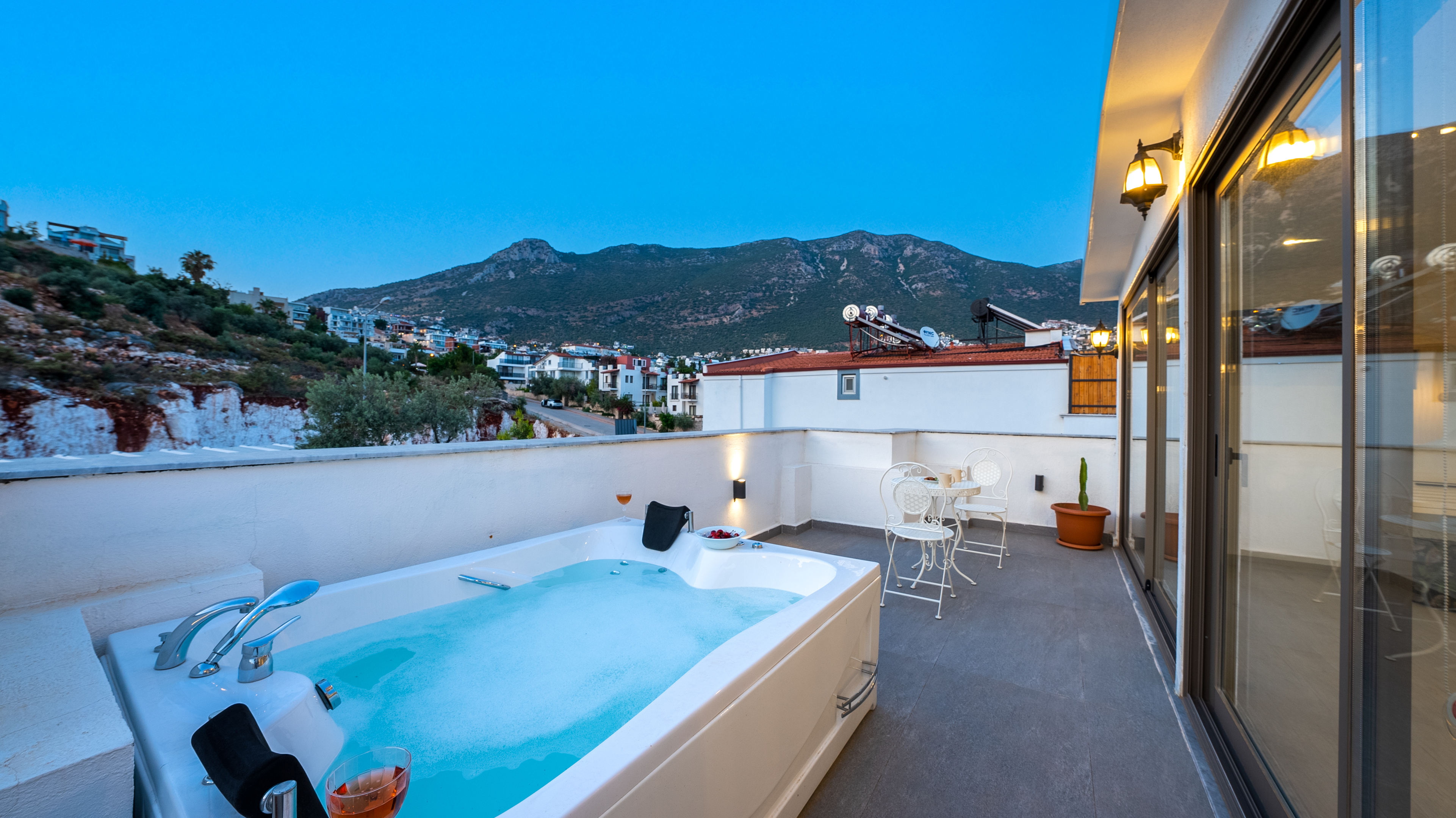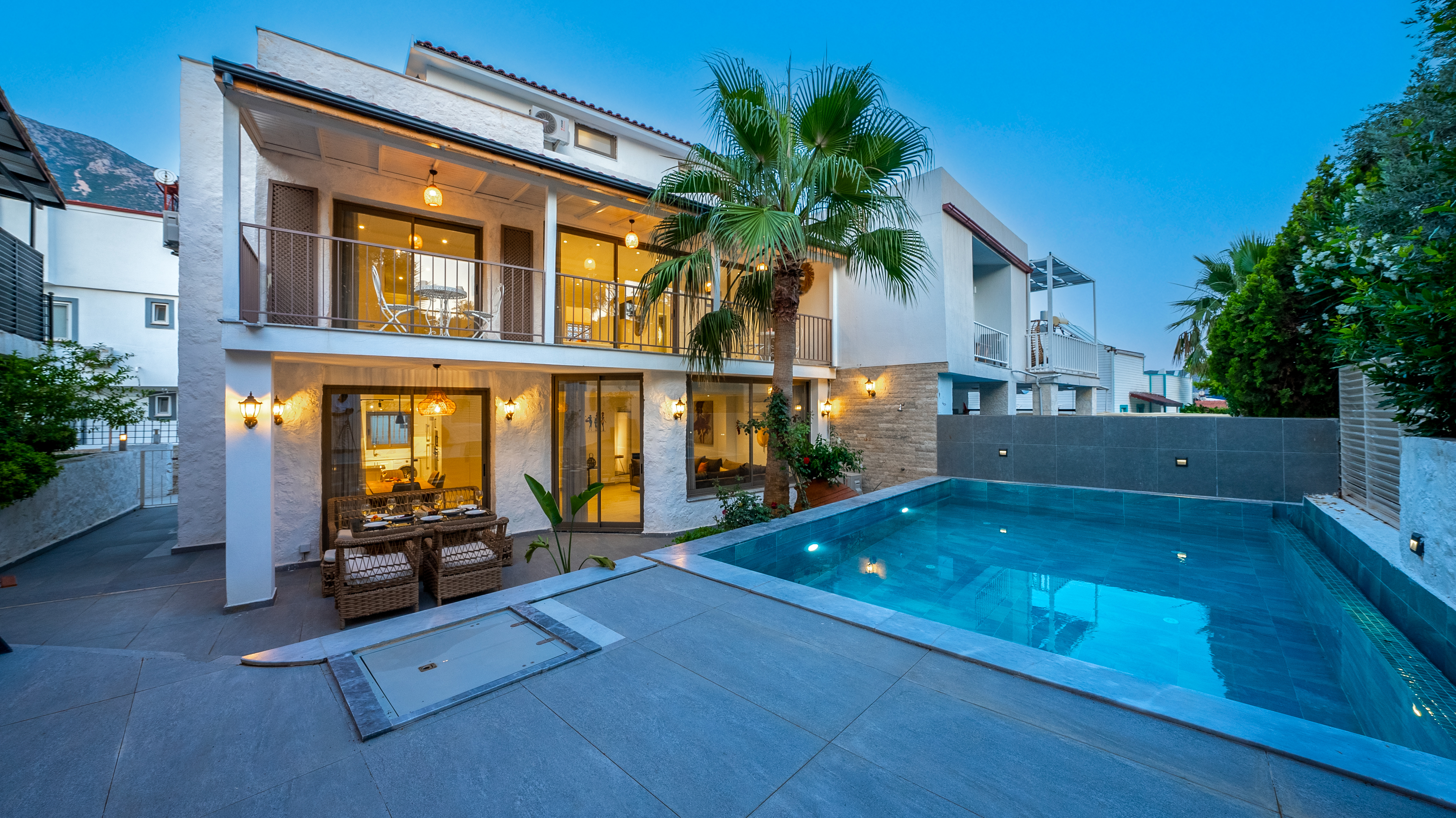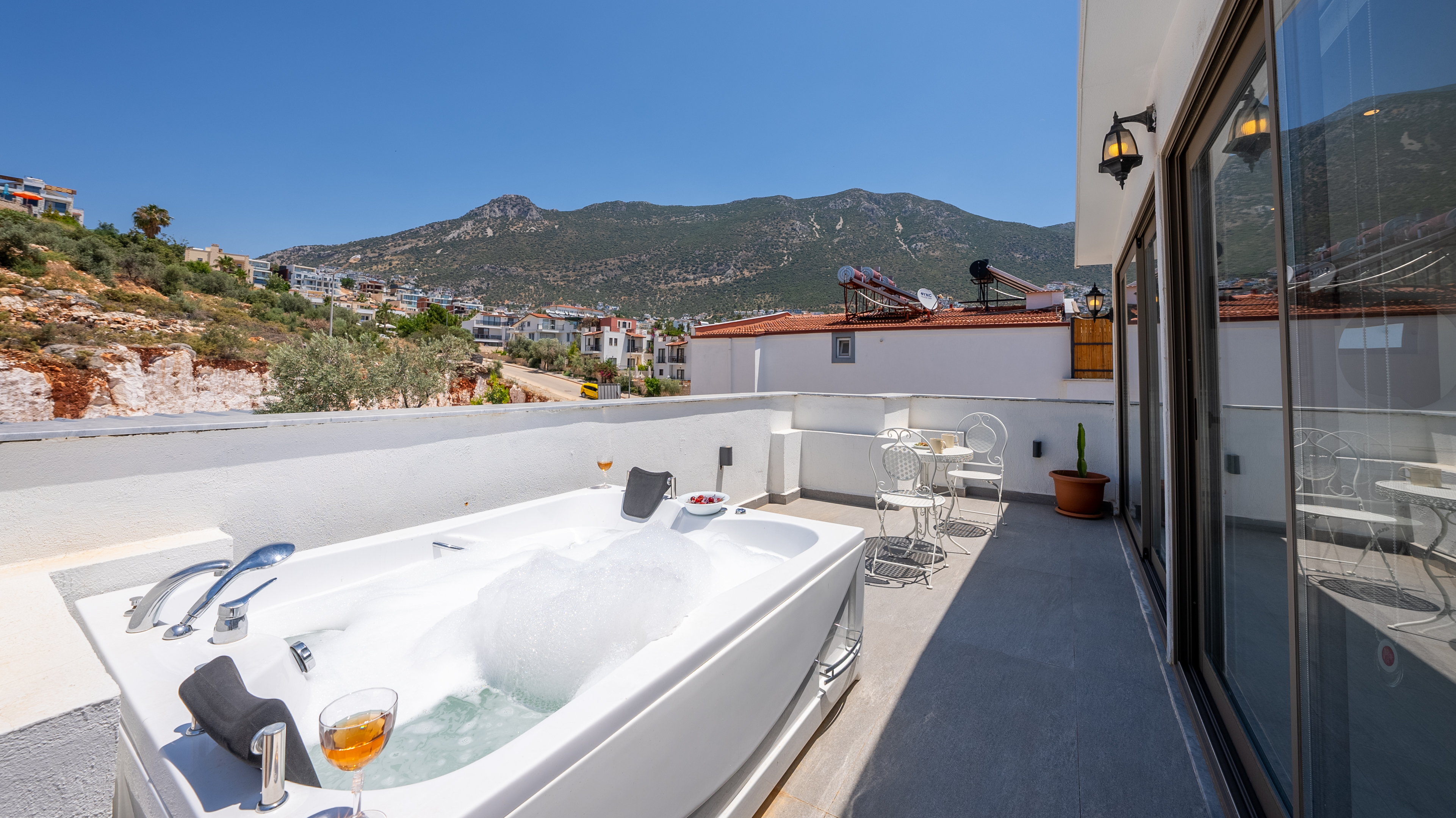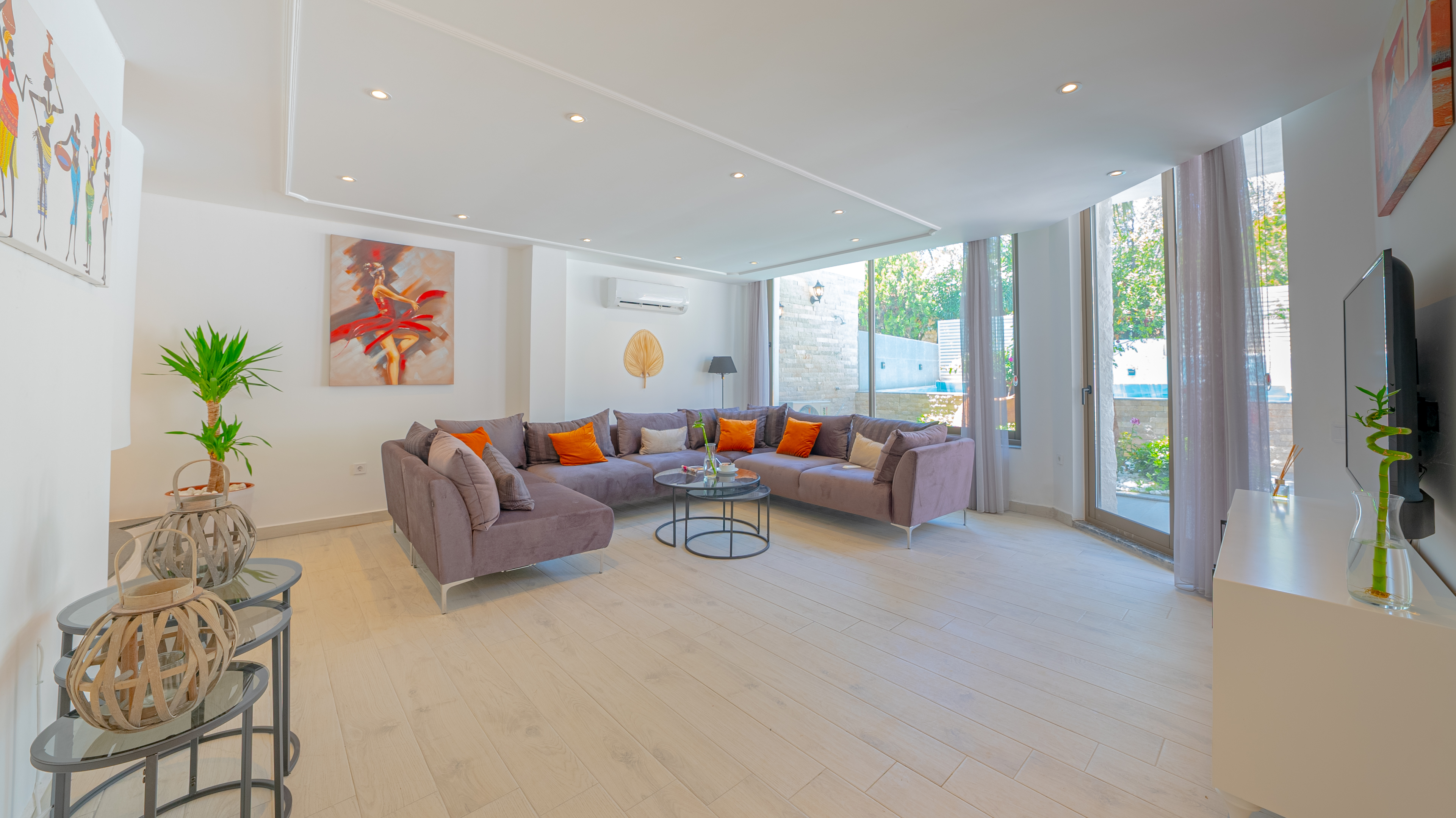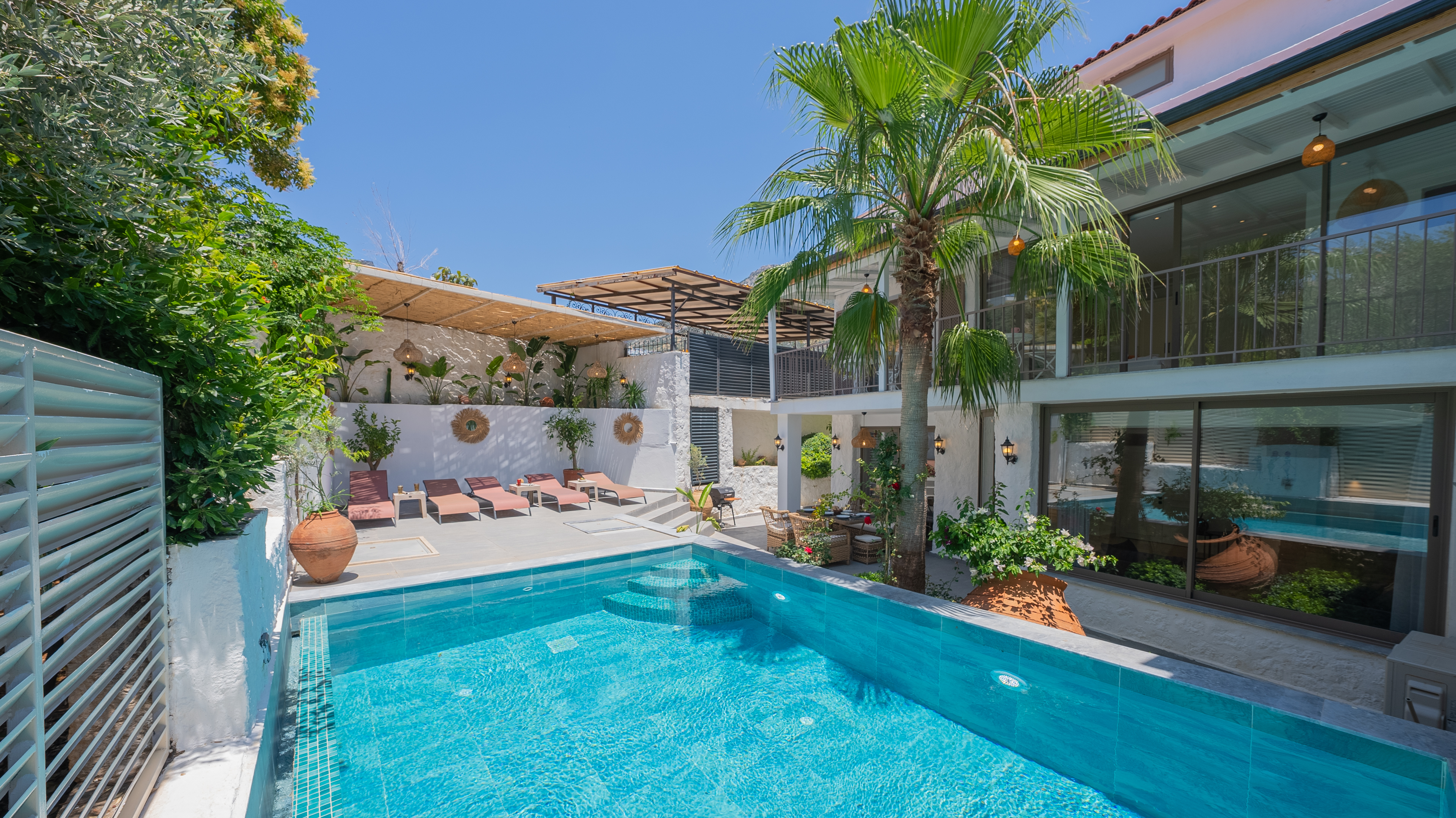 Located just one street above the Kalamar road in the centre of Kalkan), Villa Orange has recently been refurbished to a high standard and offers a secluded hidden gem surrounded by decades-old palm trees near the centre of Kalkan.