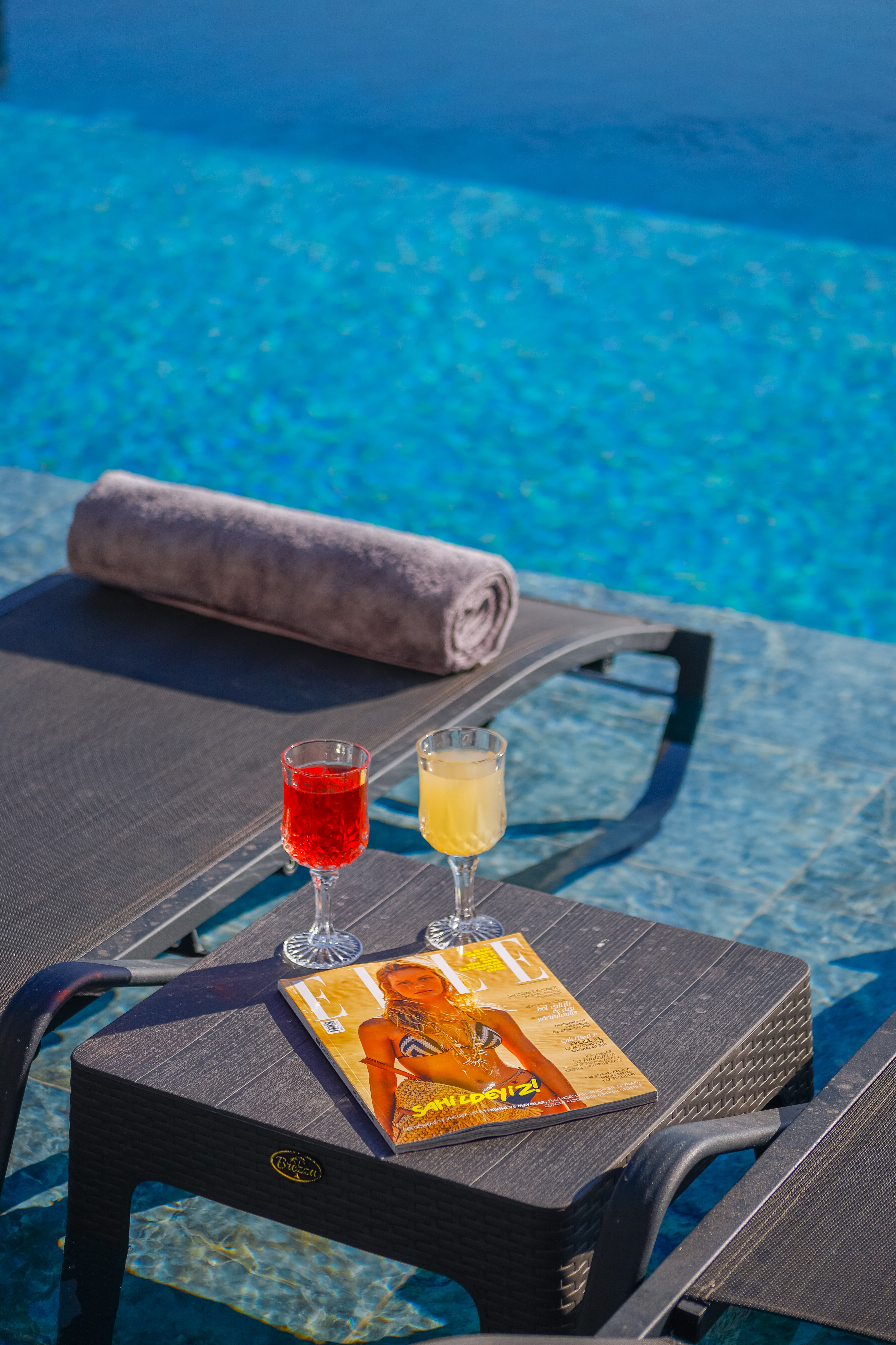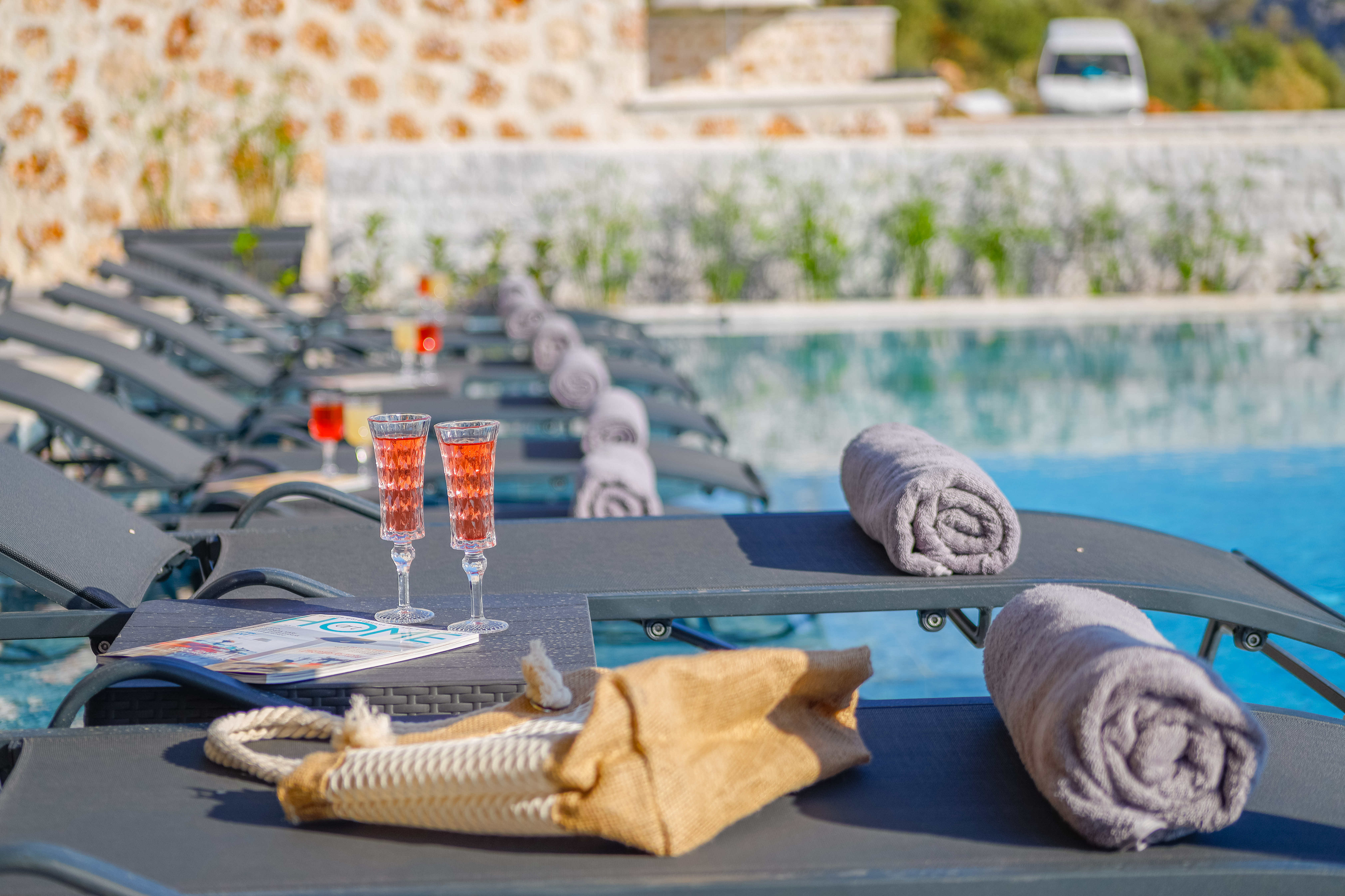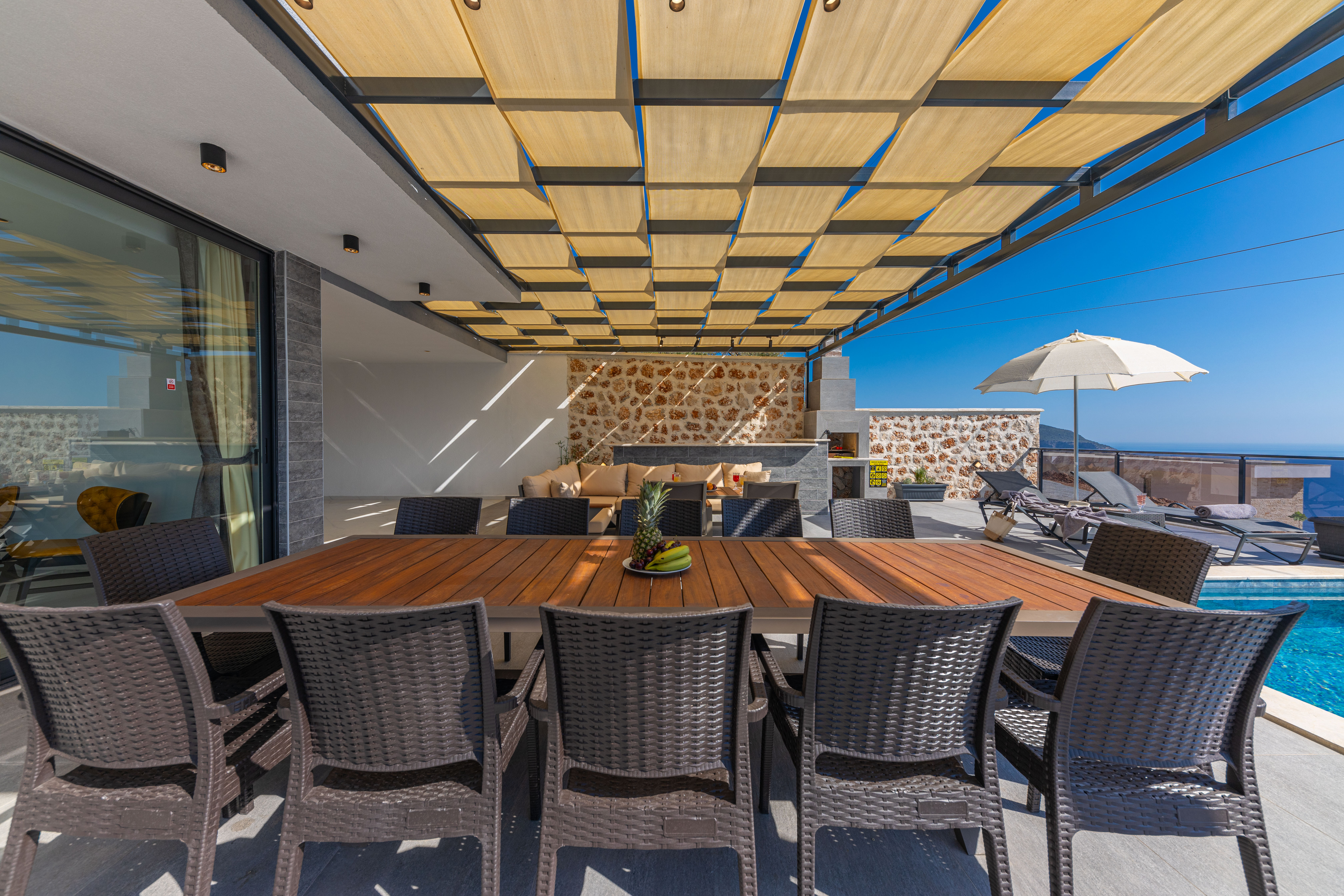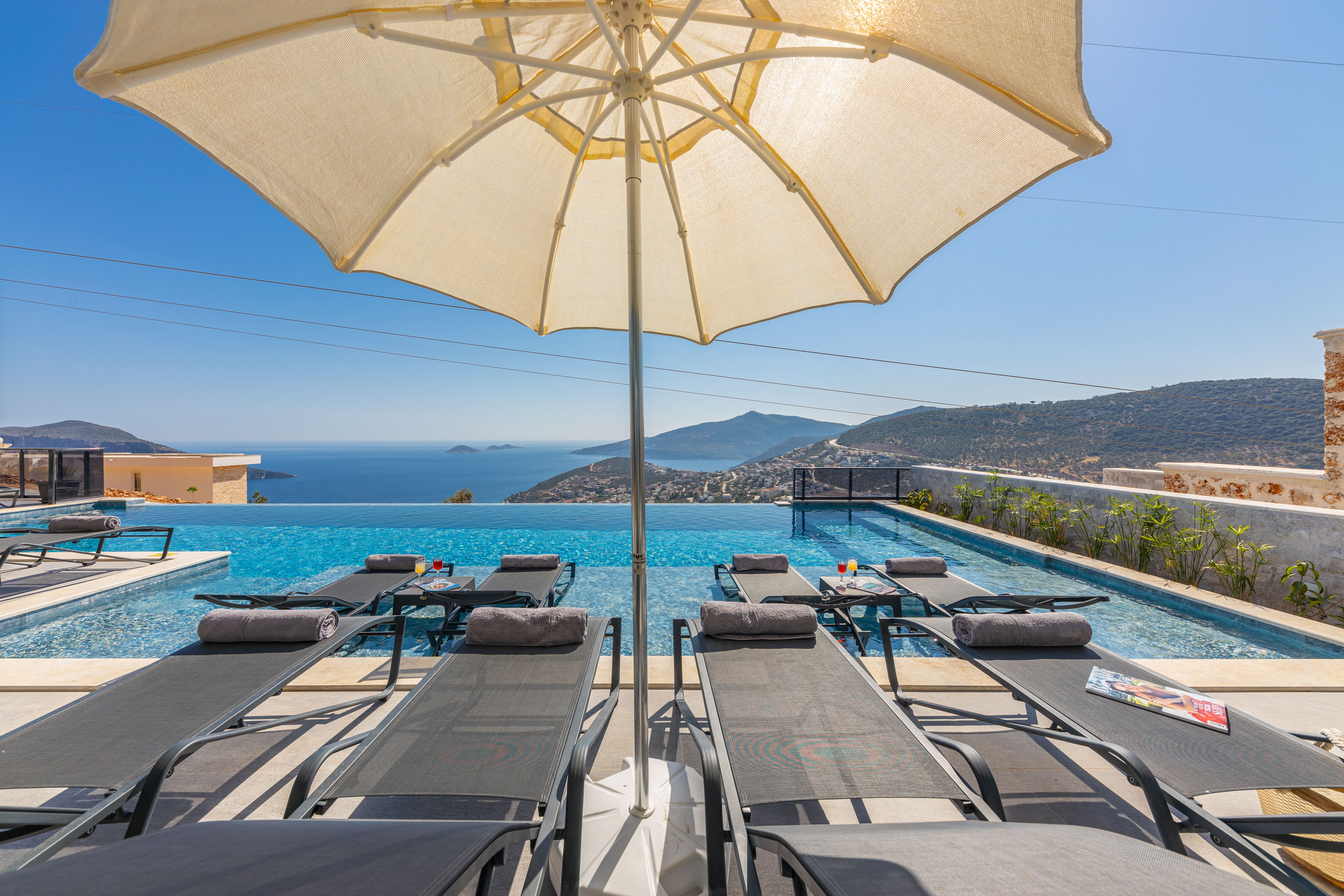 Villa Royal Falcon's superb pool terrace offers a magnificent sea view, private swimming pool, sun loungers for sunbathing, garden seating, barbecue area and beautiful scenery.