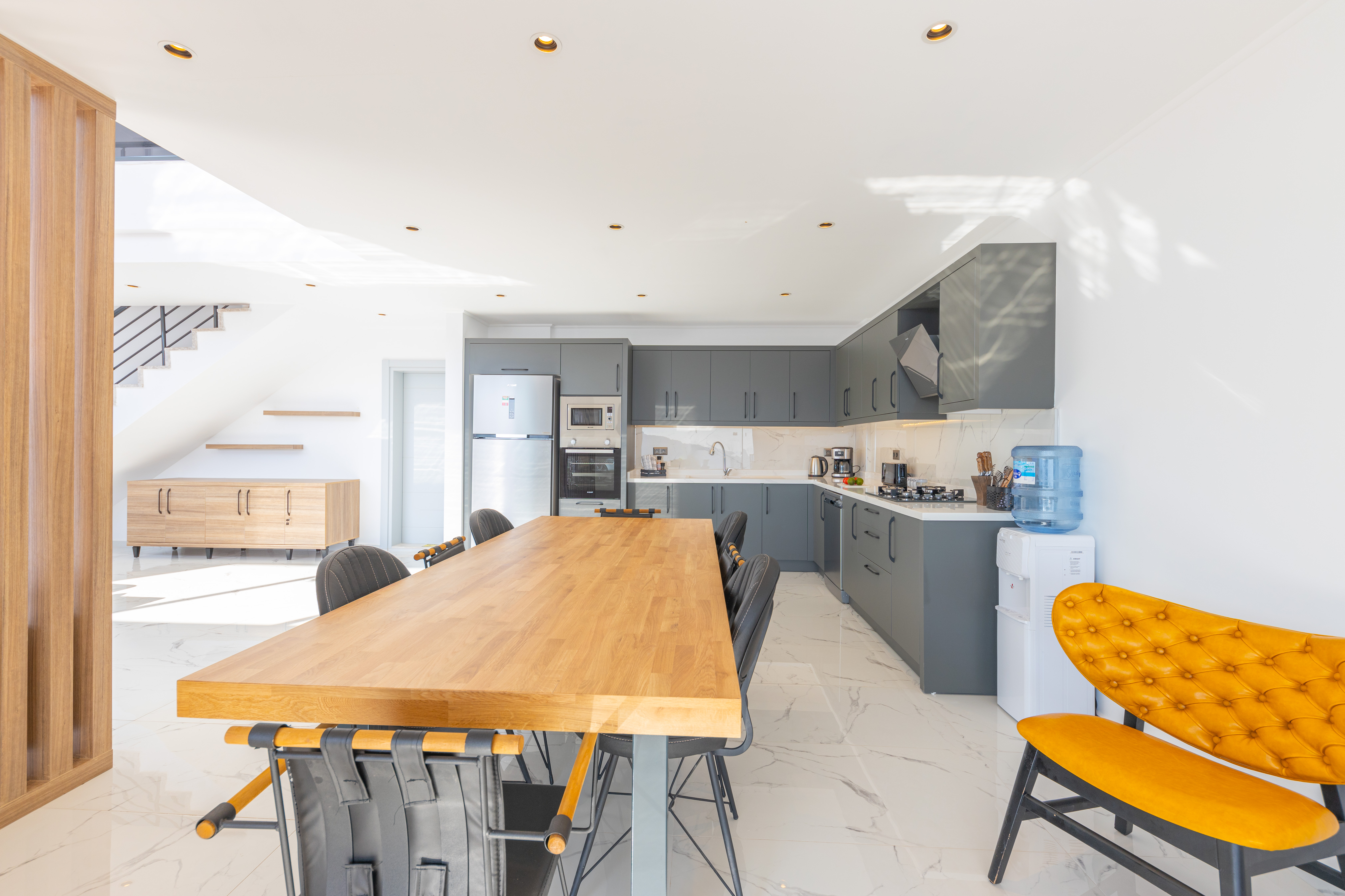 Kitchen: All details have been considered so that you can cook comfortably in the bright and spacious American kitchen. In the contemporary kitchen there's a refrigerator, dishwasher, washing machine, stove, oven, microwave, toaster, kettle, dispenser, dining table, dinnerware and cooking utensils.
