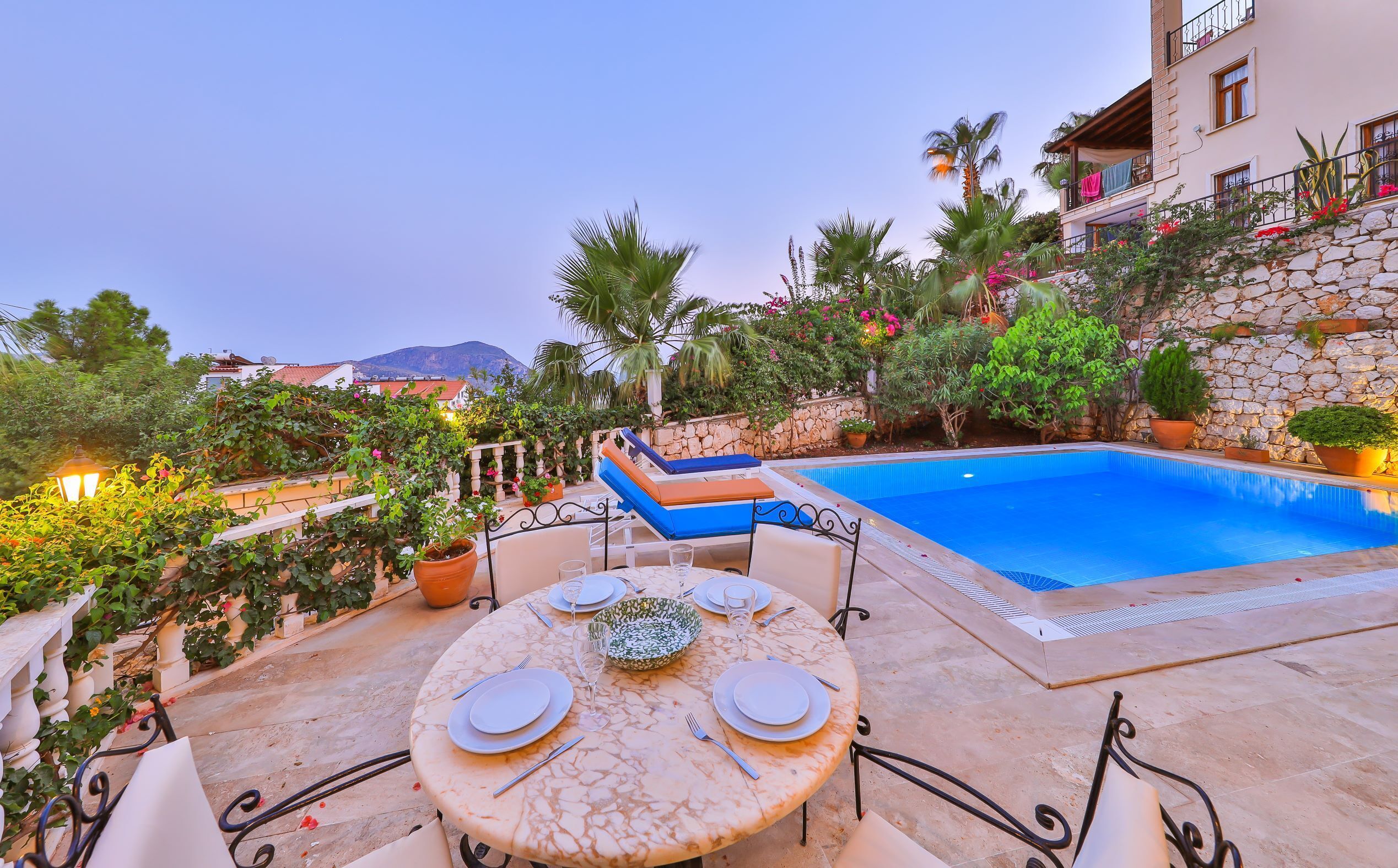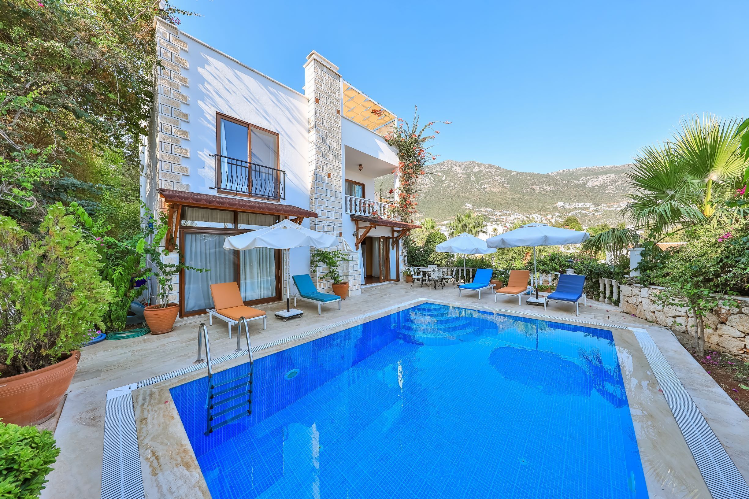 Villa Sovalye is a beautiful 3 double ensuite bedroomed villa, with a superb private pool set in lush tropical gardens with spectacular views of Kalkan bay and the Taurus mountains; located in a peaceful area, but still only a genuine 10 min walk to the village and market - and just 5 mins from restaurants and shops nearby. There are no steep hills and, if you do prefer to take a taxi, it is very cheap!